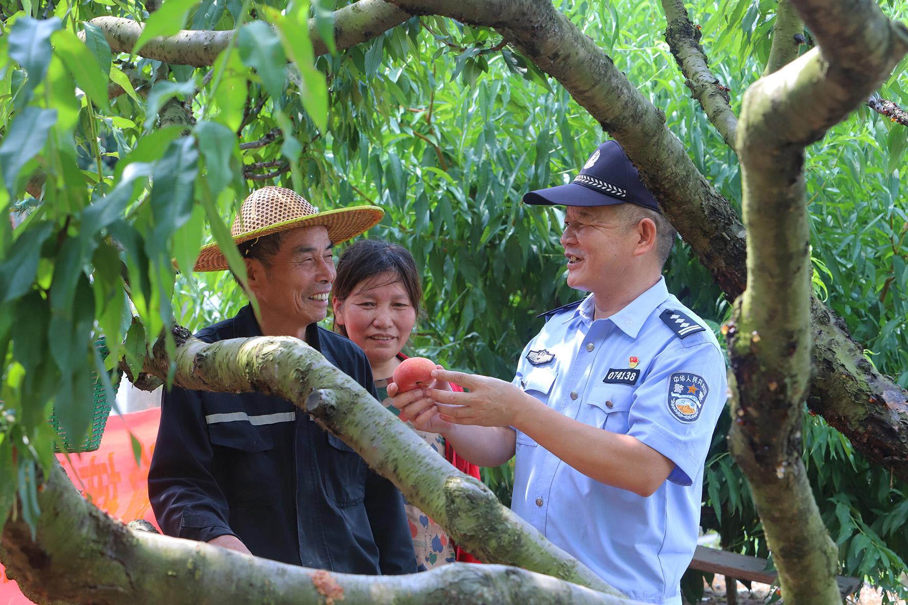 7月18日,浙江省臺(tái)州市路橋區(qū)螺洋街道上寺前村,螺洋派出所民警在蟠桃園區(qū)向果農(nóng)宣傳防范電信網(wǎng)絡(luò)詐騙知識(shí)。