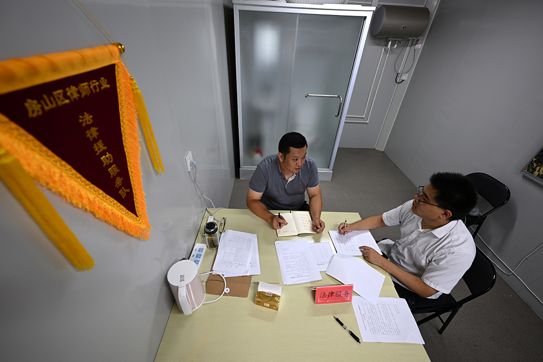 安置點(diǎn)司法工作室,房山司法局基層科科長及識(shí)宇(左)與值班律師盤點(diǎn)工作重點(diǎn)。
