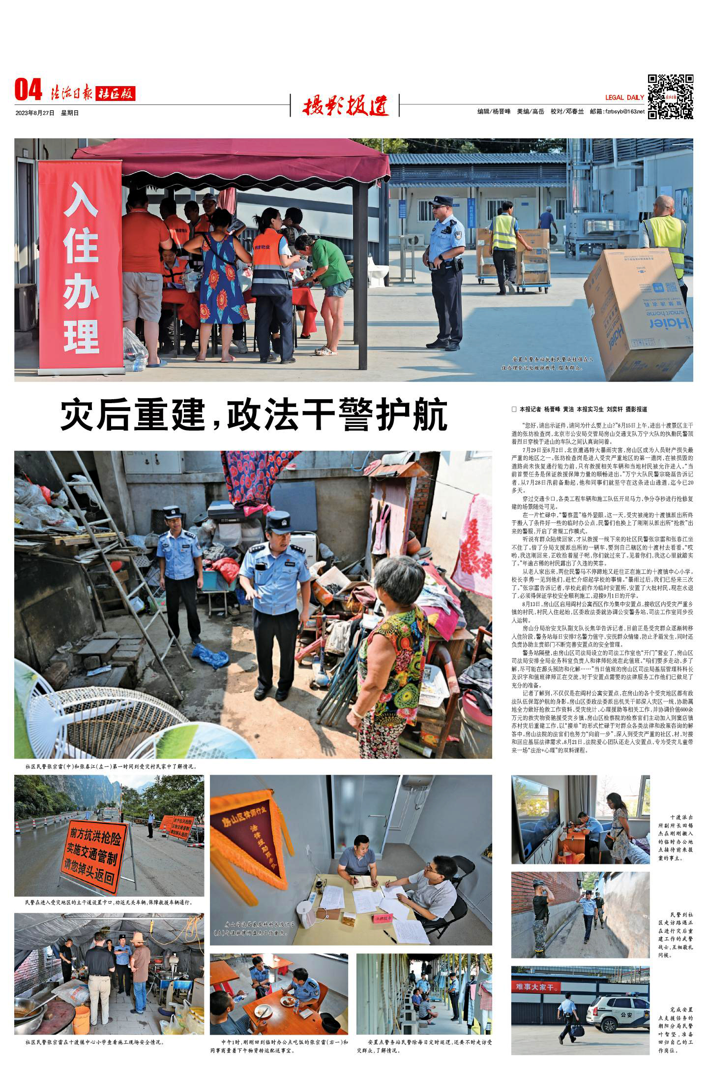 記者了解到,不僅僅是在閻村公寓安置點(diǎn),在房山的各個(gè)受災(zāi)地區(qū)都有政法隊(duì)伍保駕護(hù)航的身影。房山區(qū)委政法委派出機(jī)關(guān)干部深入災(zāi)區(qū)一線,協(xié)助屬地全力做好搶救工作資料、受災(zāi)統(tǒng)計(jì)、心理援助等相關(guān)工作,并協(xié)調(diào)價(jià)值600余萬元的救災(zāi)物資馳援受災(zāi)鄉(xiāng)鎮(zhèn)。房山區(qū)檢察院的檢察官們主動(dòng)加入到竇店鎮(zhèn)蘇村災(zāi)后重建工作,以“接單”的形式忙碌于對(duì)群眾各類法律和政策咨詢的解答中。房山法院的法官們也努力“向前一步”,深入到受災(zāi)嚴(yán)重的社區(qū)、村,對(duì)接和回應(yīng)基層法律需求。8月21日,法院愛心團(tuán)隊(duì)還走入安置點(diǎn),專為受災(zāi)兒童帶來一場“法治+心理”的雙料課程。