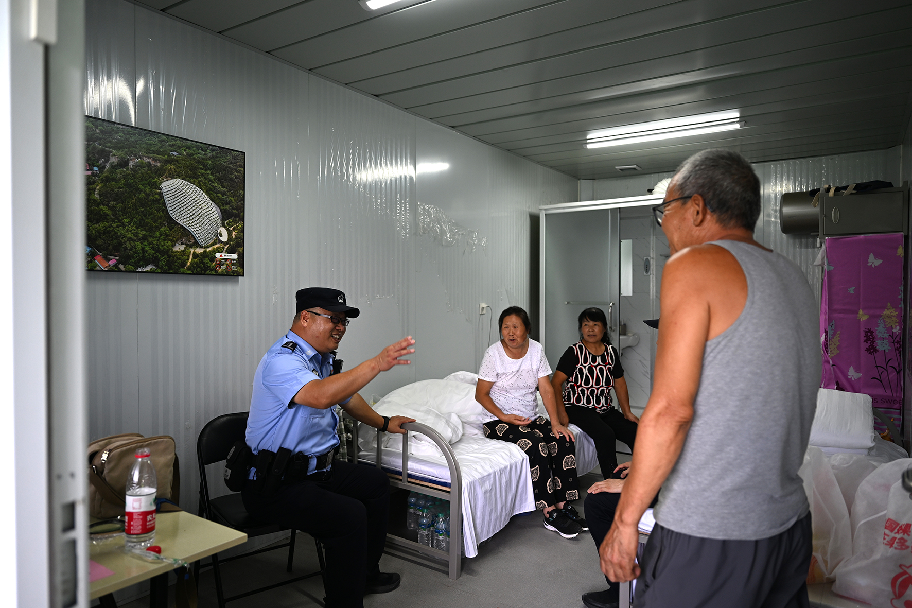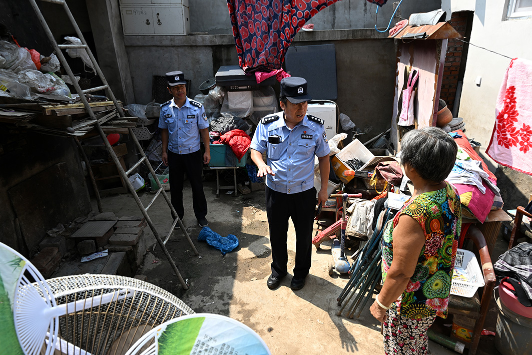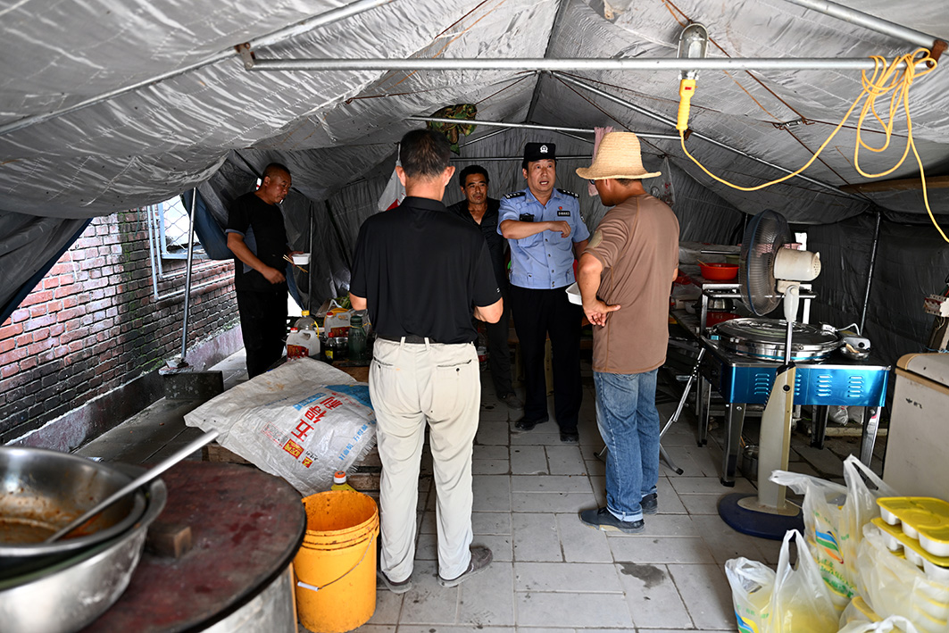 安置點(diǎn)警務(wù)站民警除每日定時(shí)巡邏,還要不時(shí)走訪受災(zāi)群眾,了解情況。