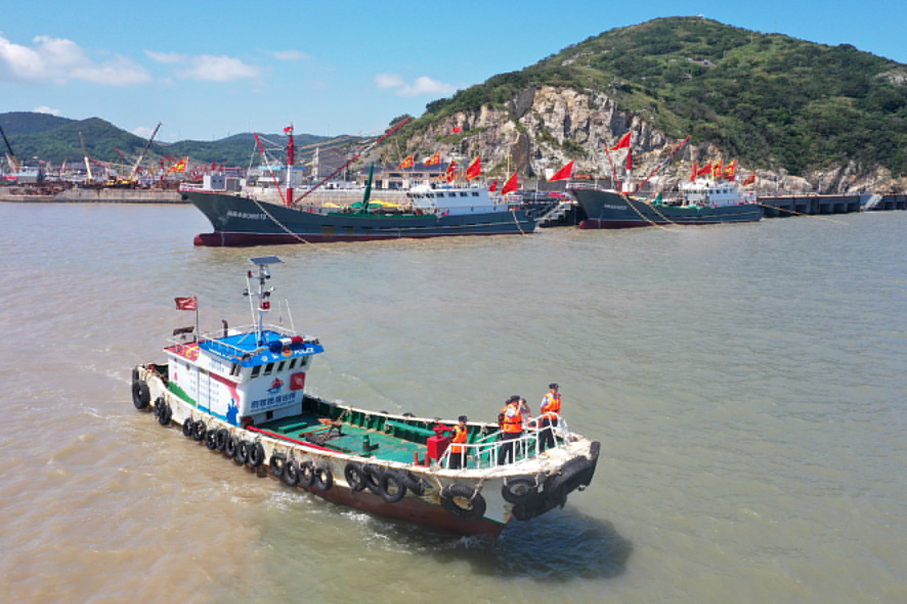 9月11日,東海即將全面開捕,浙江省舟山市岱山縣公安局羅家岙派出所民警乘坐“瀛洲紅帆船”開展海上巡查行動,加強漁港碼頭治安管控力度,為護航平安亞運再加碼。