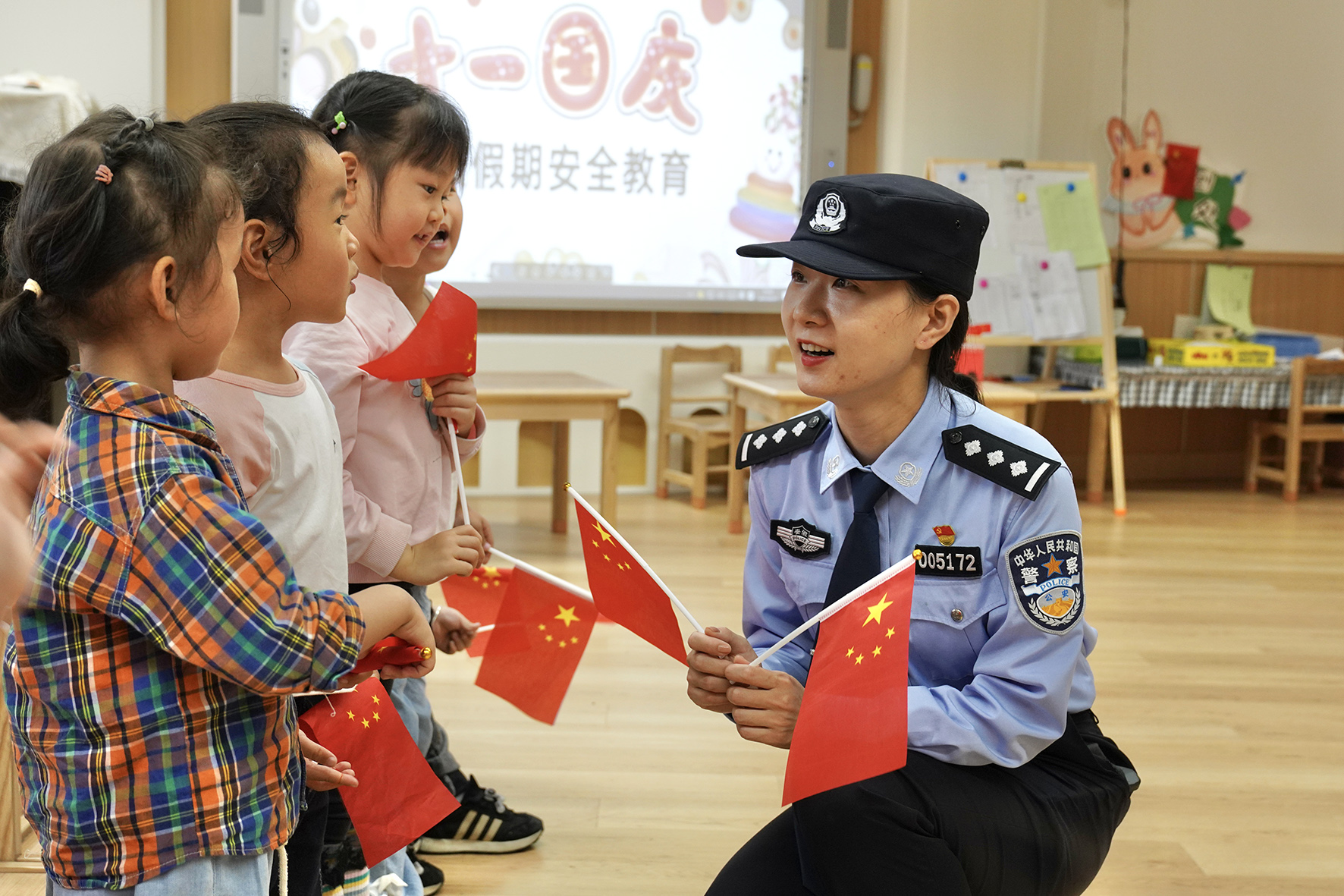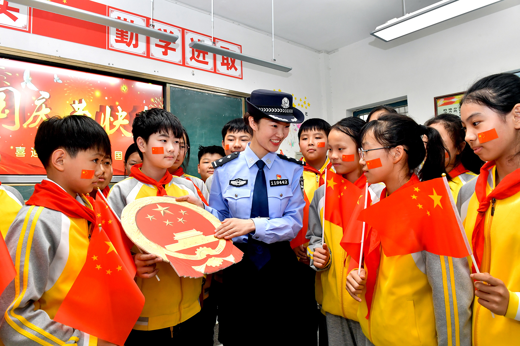 9月27日,安徽省合肥市公安局瑤海分局龍崗派出所民警輔警走進轄區(qū)幼兒園開展“我為祖國送祝?!敝黝}教育活動。