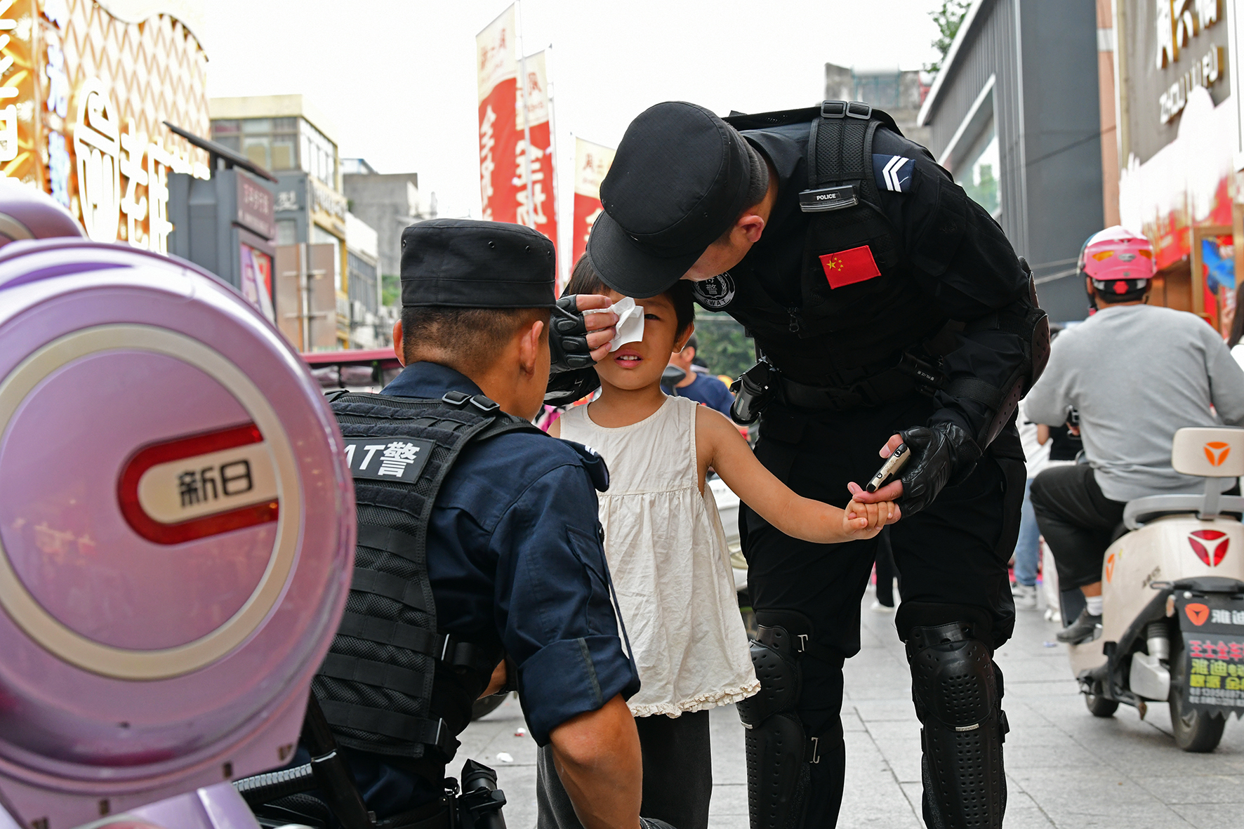 10月1日,安徽省阜南縣巡防大隊(duì)民輔警在城區(qū)萬(wàn)宇商業(yè)街區(qū)巡邏時(shí)發(fā)現(xiàn)一名走失幼童。經(jīng)過半小時(shí)的尋找,終于在一地下商場(chǎng)內(nèi)通過喊話找到了幼童家人。