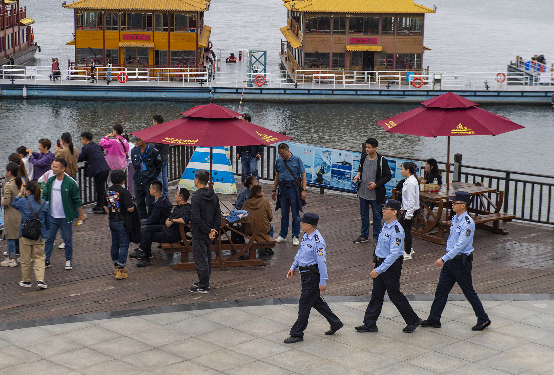 10月5日,山東省棗莊市公安局山亭分局馮卯派出所民輔警在巖馬湖畔開展巡邏防控,提醒小朋友注意安全。