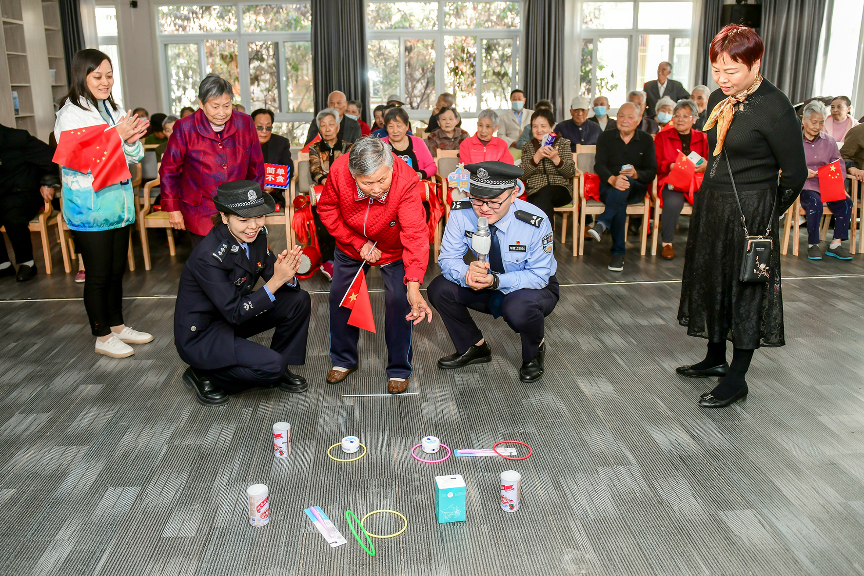10月20日,安徽省馬鞍山市和縣公安局歷陽派出所民警與蓮邦安老頤養(yǎng)中心的老人一起玩“套圈圈”游戲,喜迎重陽節(jié)。