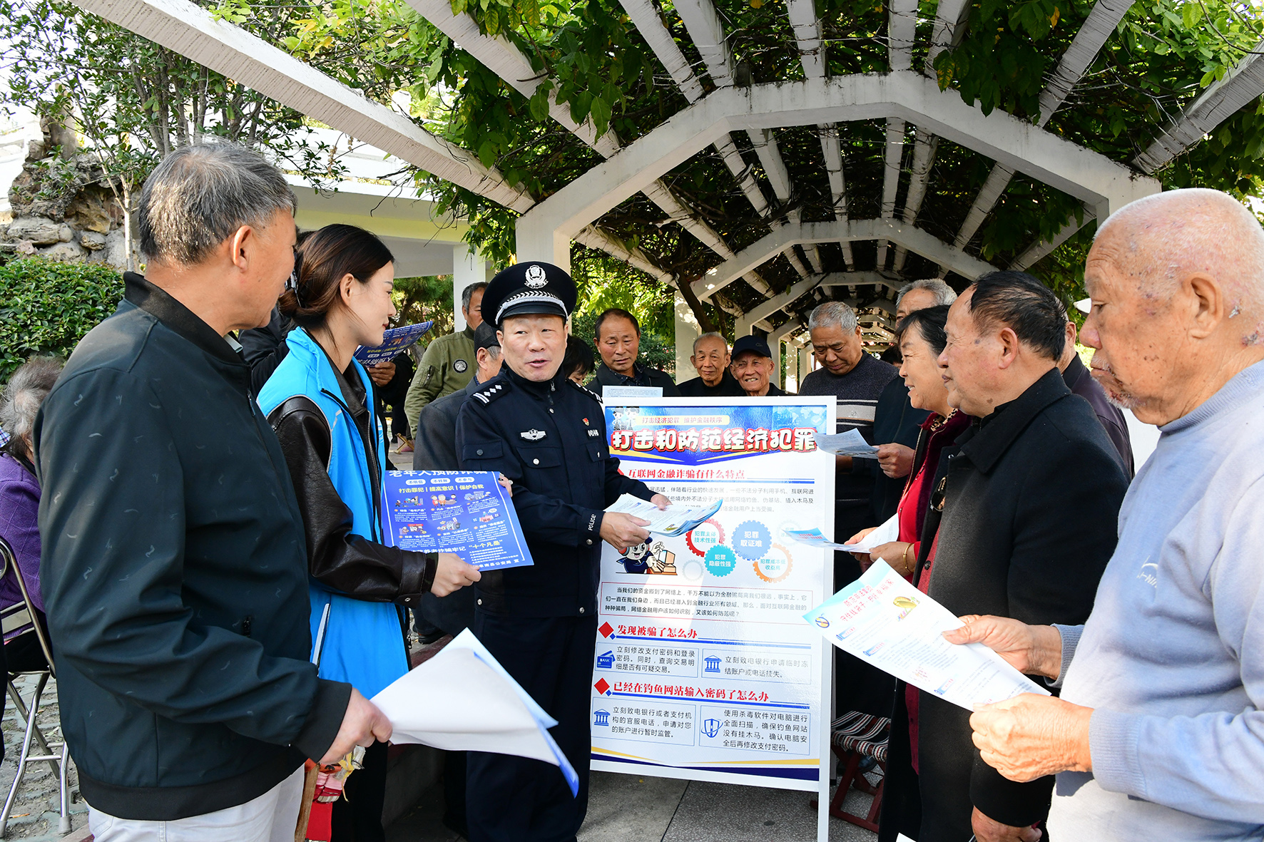 10月23日,安徽省阜南縣公安局民警在街心公園向老人們宣講防范養(yǎng)老詐騙知識(shí)。