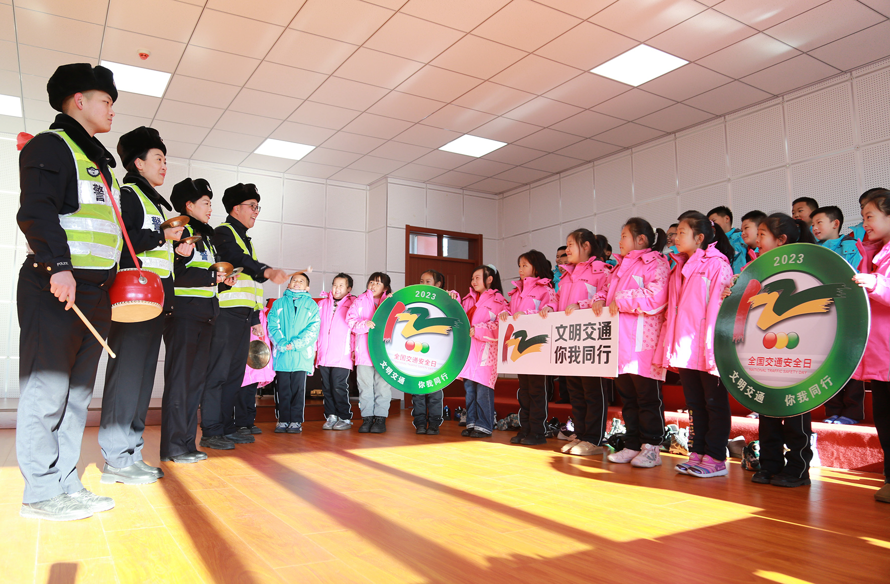 圖為民警為同學(xué)們表演交通安全知識“三句半”。