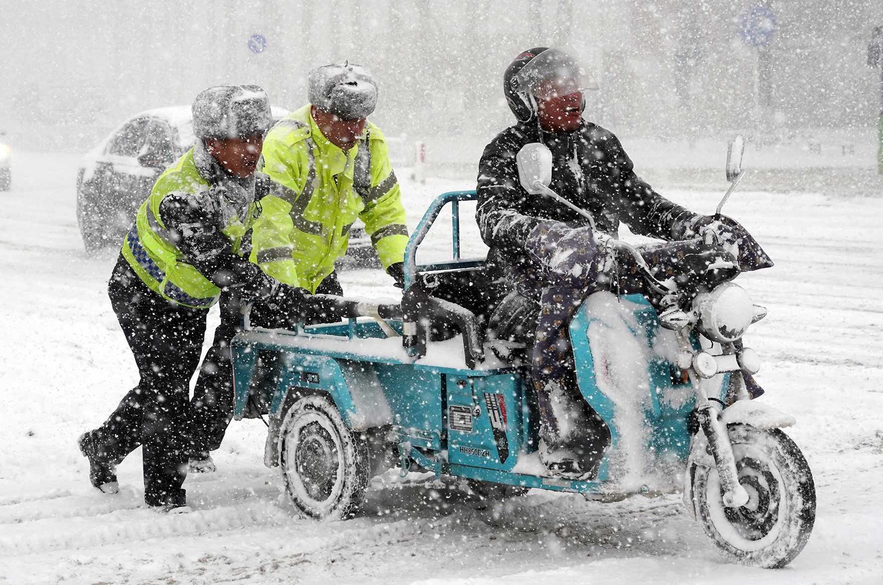 12月16日,山東省煙臺(tái)市公安局交警支隊(duì)二大隊(duì)民警冒雪救助受困車輛。