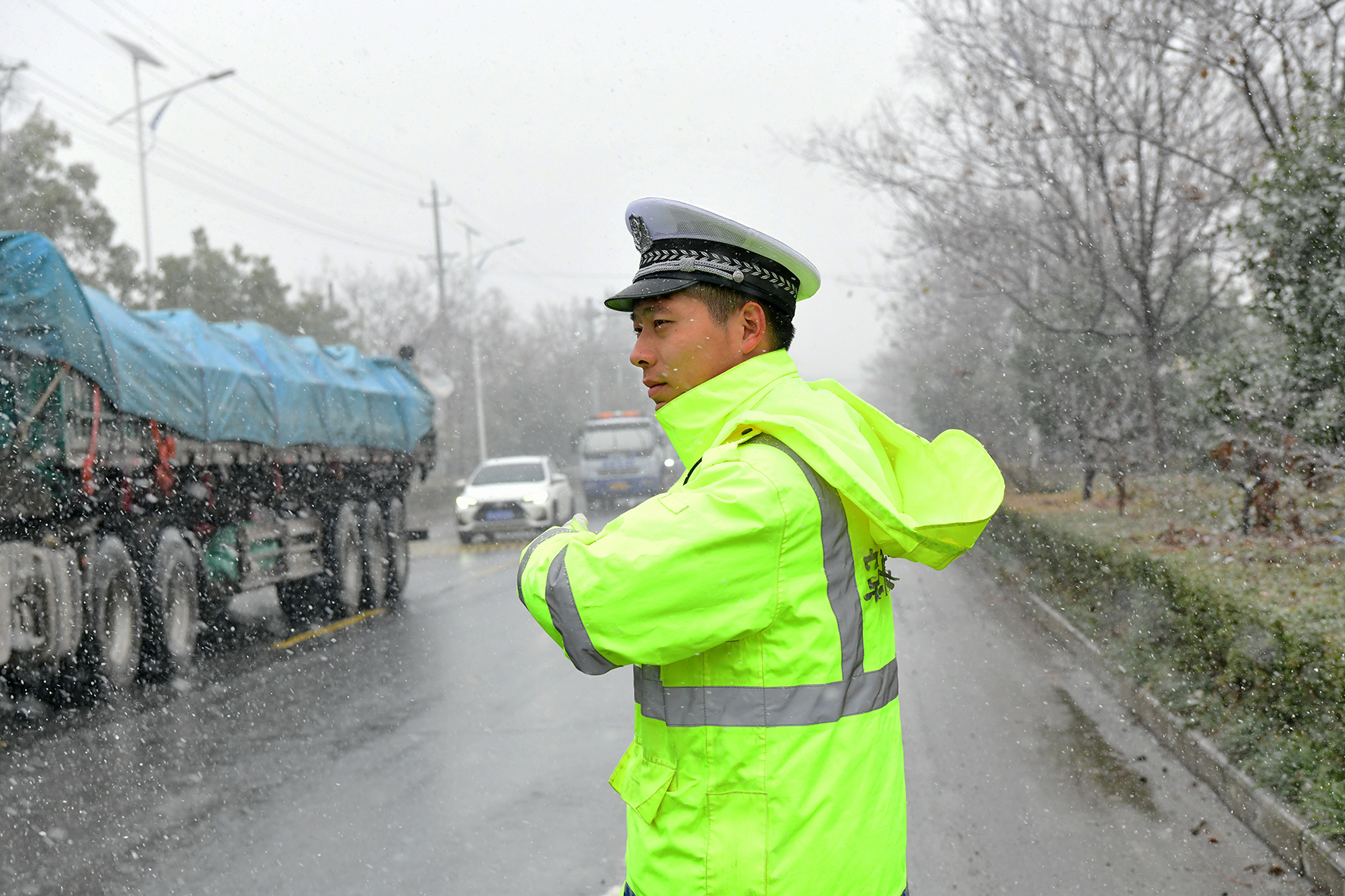 12月15日,安徽省阜南縣公安局交管大隊(duì)民警在省道318中崗鎮(zhèn)一路段冒風(fēng)雪維持交通秩序。
