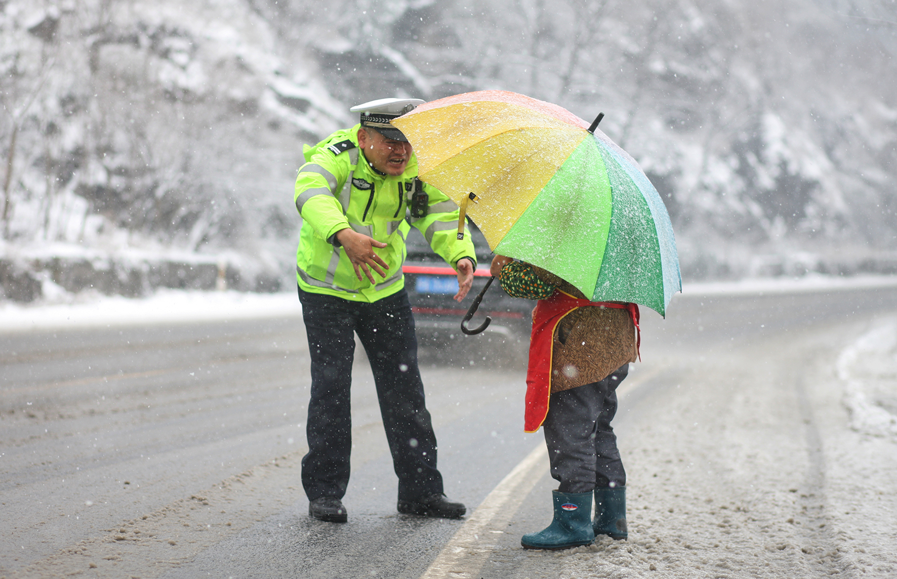 12月18日,安徽省巢湖市公安局交警大隊(duì)民警提示一名老年人雪天過(guò)馬路注意交通安全,并將其安全護(hù)送過(guò)馬路。