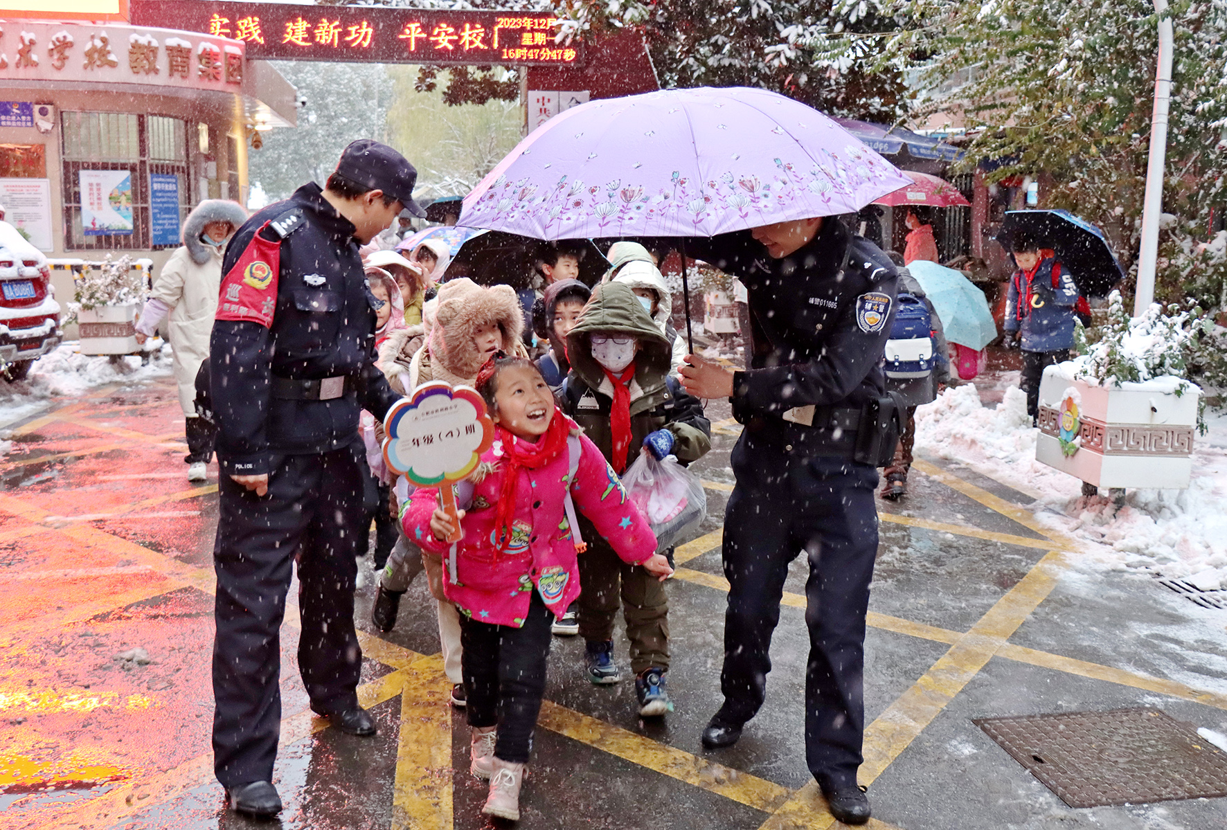 12月18日,安徽省合肥市公安局瑤海分局民輔警加強(qiáng)“護(hù)學(xué)”模式,為雪天出行的廣大師生“保駕護(hù)航”。