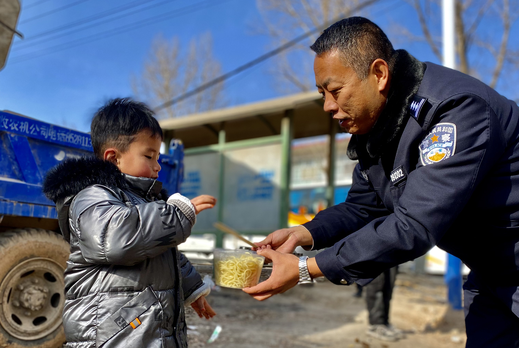 圖一:12月20日,民警向小孩子送上一份暖心的熱飯。