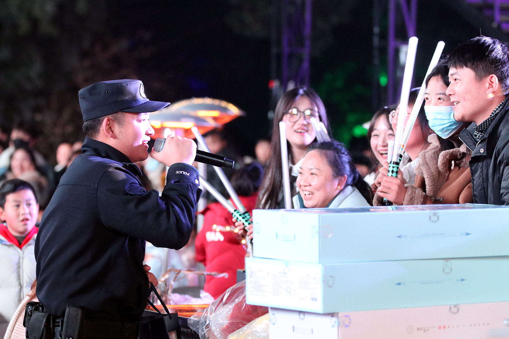 2023年12月31日,安徽省蕪湖市方特景區(qū)舉行大型跨年夜慶?;顒?。蕪湖市公安局民警現(xiàn)場與游客互動,宣傳反詐、交通等安全知識。