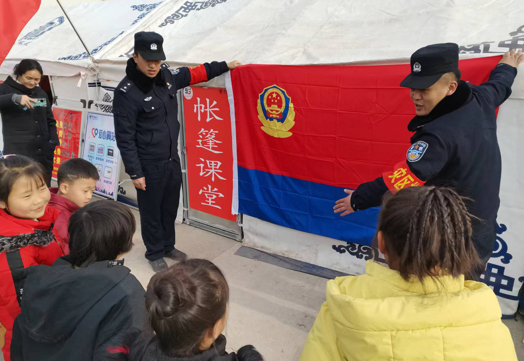 1月10日上午,在甘肅省積石山縣大河家鎮(zhèn)大河村“抗震前線110”警務(wù)室,永靖縣公安局支援民警給小學(xué)生們上一堂警察節(jié)知識課。