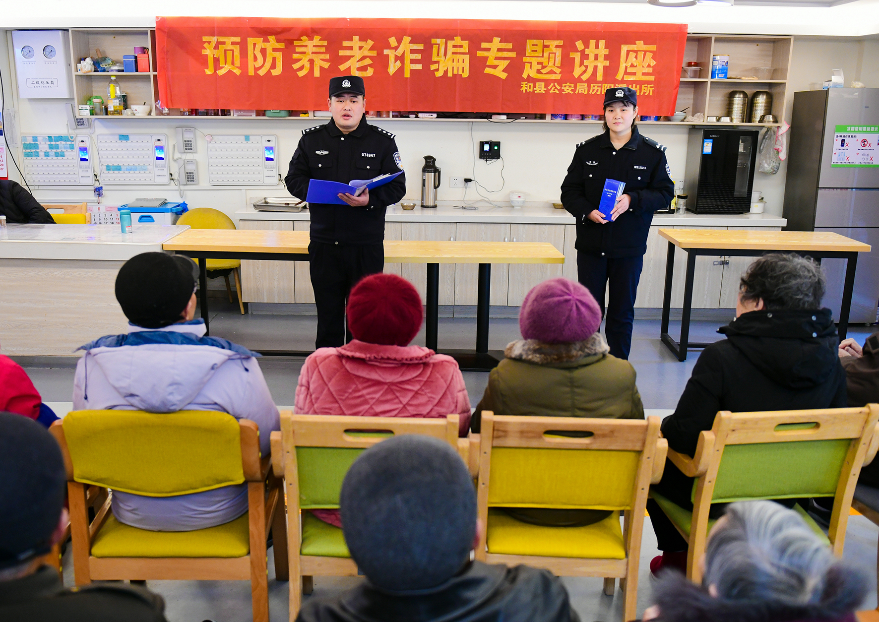 1月22日,安徽省馬鞍山市和縣公安局民警在養(yǎng)老中心向老人開展防范養(yǎng)老詐騙宣傳。