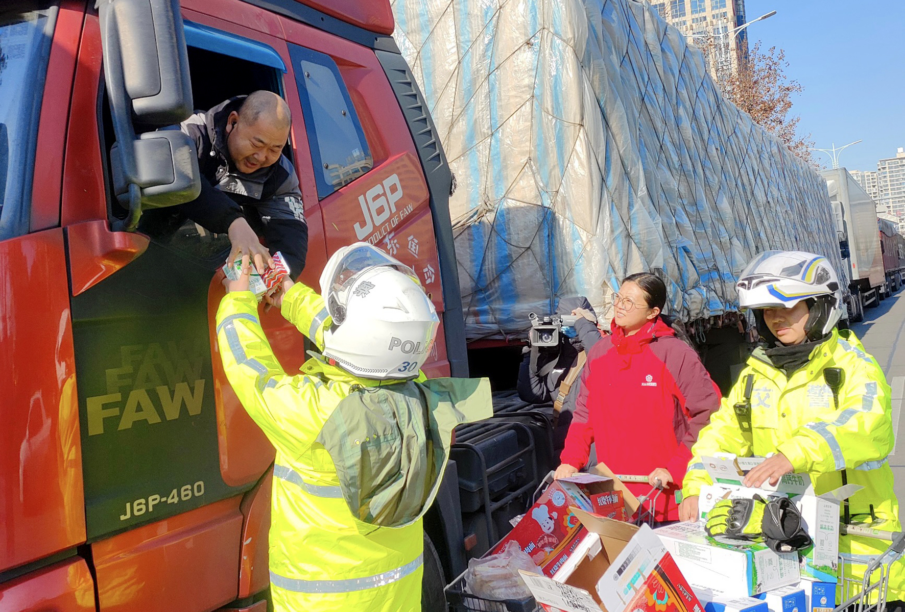 1月23日,浙江省臺(tái)州市天臺(tái)縣境內(nèi)部分高速路段結(jié)冰,導(dǎo)致多輛貨車(chē)滯留在高速路口。天臺(tái)縣公安局交通警察大隊(duì)聯(lián)合公益組織為滯留貨車(chē)司機(jī)們送上“愛(ài)心食物”。