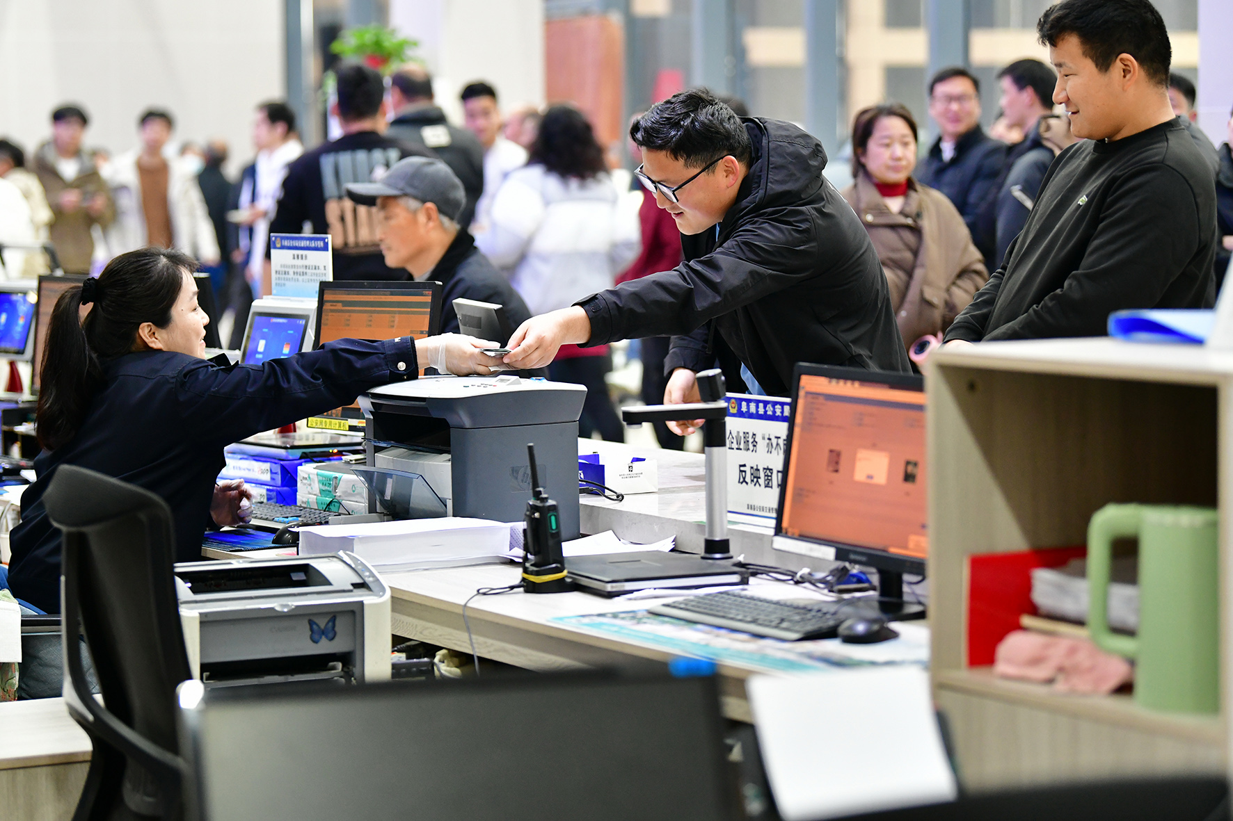 2月18日,安徽省阜南縣公安局交管大隊(duì)車管所工作人員在為群眾辦理車駕管業(yè)務(wù)。春節(jié)假期結(jié)束第一天,阜南縣公安局交管大隊(duì)車管所服務(wù)大廳內(nèi)迎來(lái)業(yè)務(wù)高峰,車管所開(kāi)啟“延時(shí)服務(wù)”工作模式,全力保障業(yè)務(wù)辦理高效有序,為群眾紓困解難。
