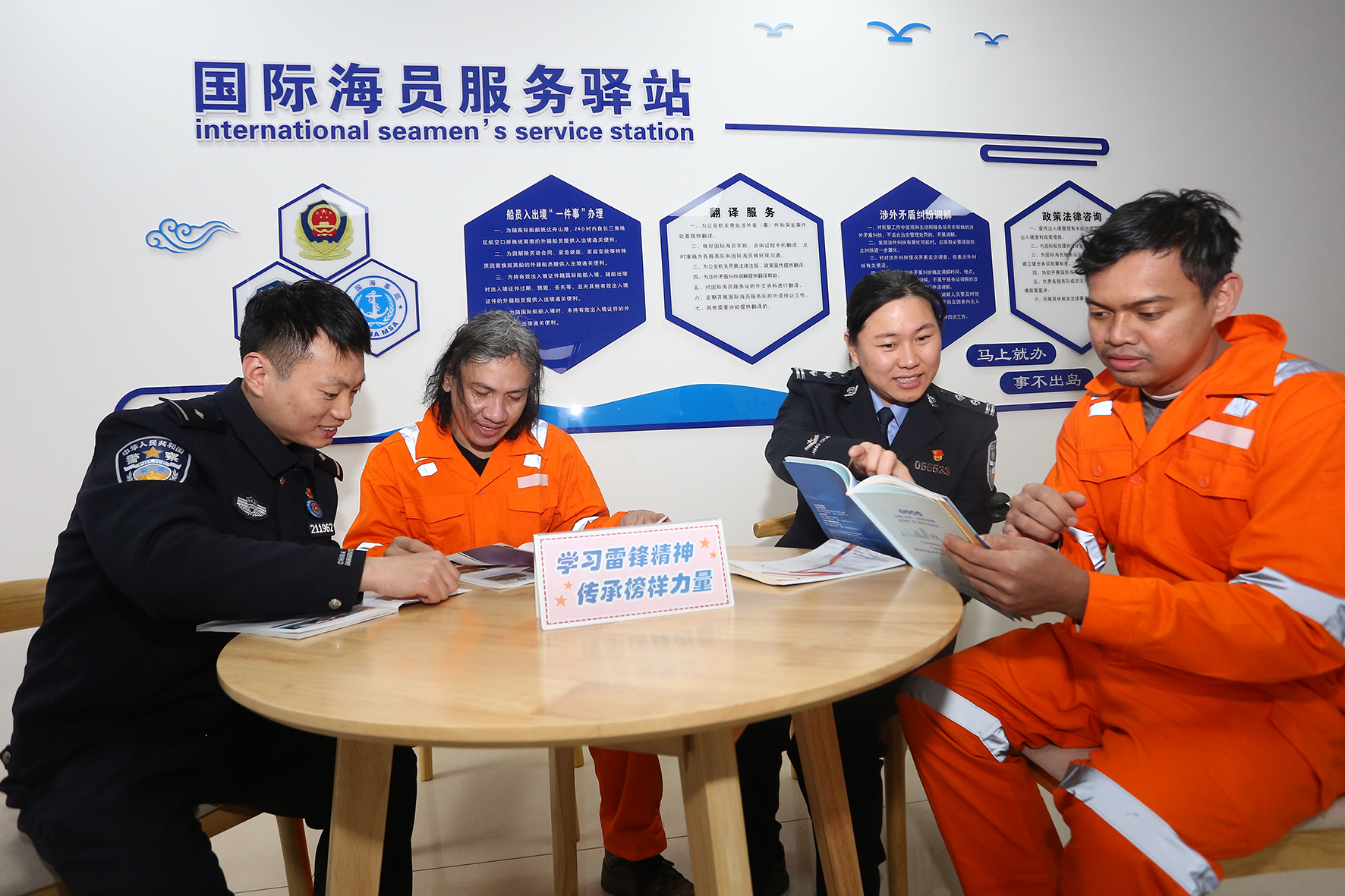 圖為民警正在為國(guó)際海員進(jìn)行政策宣講、解答。