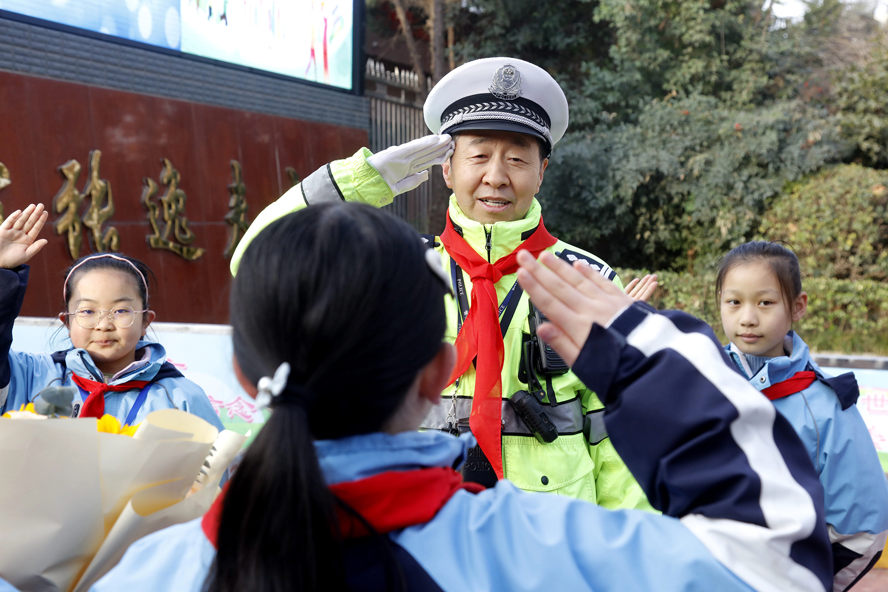 在老師的帶領(lǐng)下,同學(xué)們準(zhǔn)備了鮮花和紅領(lǐng)巾送給老民警李太平,感謝他的一路守護(hù)。
