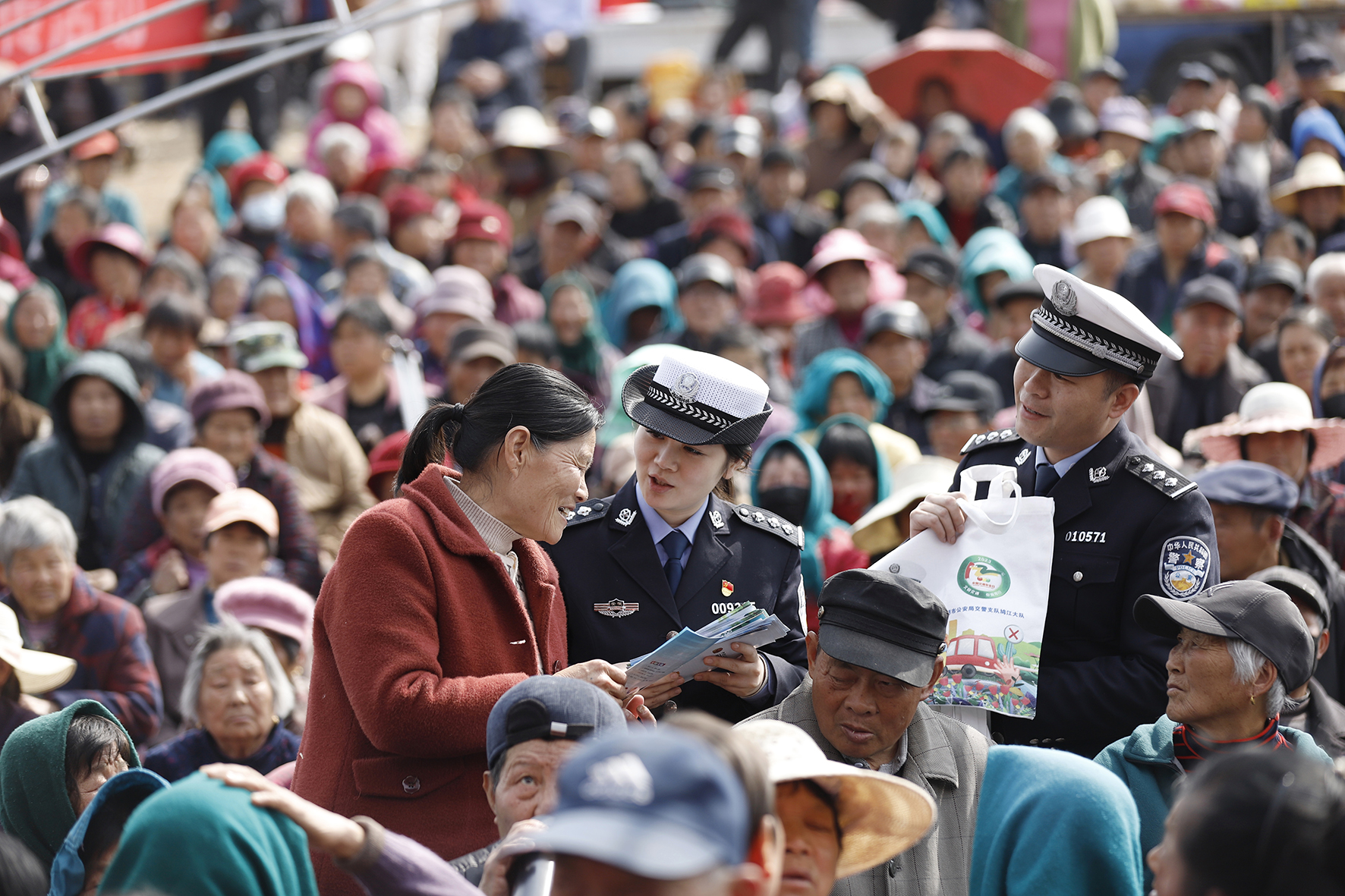 3月8日,安徽省蕪湖市公安局交警支隊鳩江大隊民警在湯溝鎮(zhèn)前進(jìn)村廬劇演出現(xiàn)場,向群眾講解“一盔一帶”等交通安全知識。