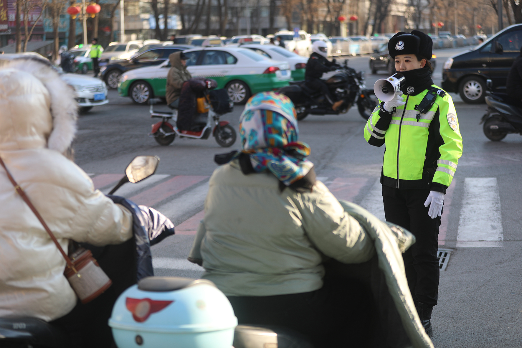 3月12日早高峰時段,遼寧省阜新市公安局交通警察支隊海州大隊民警輔警在花園崗路口對騎電動自行車沒有佩戴頭盔的市民進行勸導。