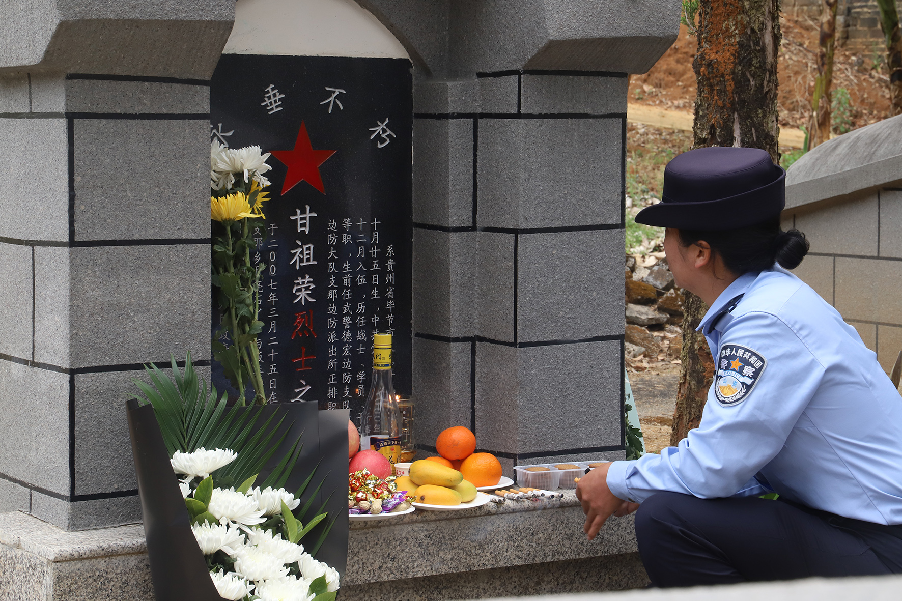 4月1日,云南出入境邊防檢查總站德宏邊境管理支隊(duì)?wèi)衾吘撑沙鏊窬视袂賮淼搅沂扛绺绺首鏄s墓前進(jìn)行祭奠。
