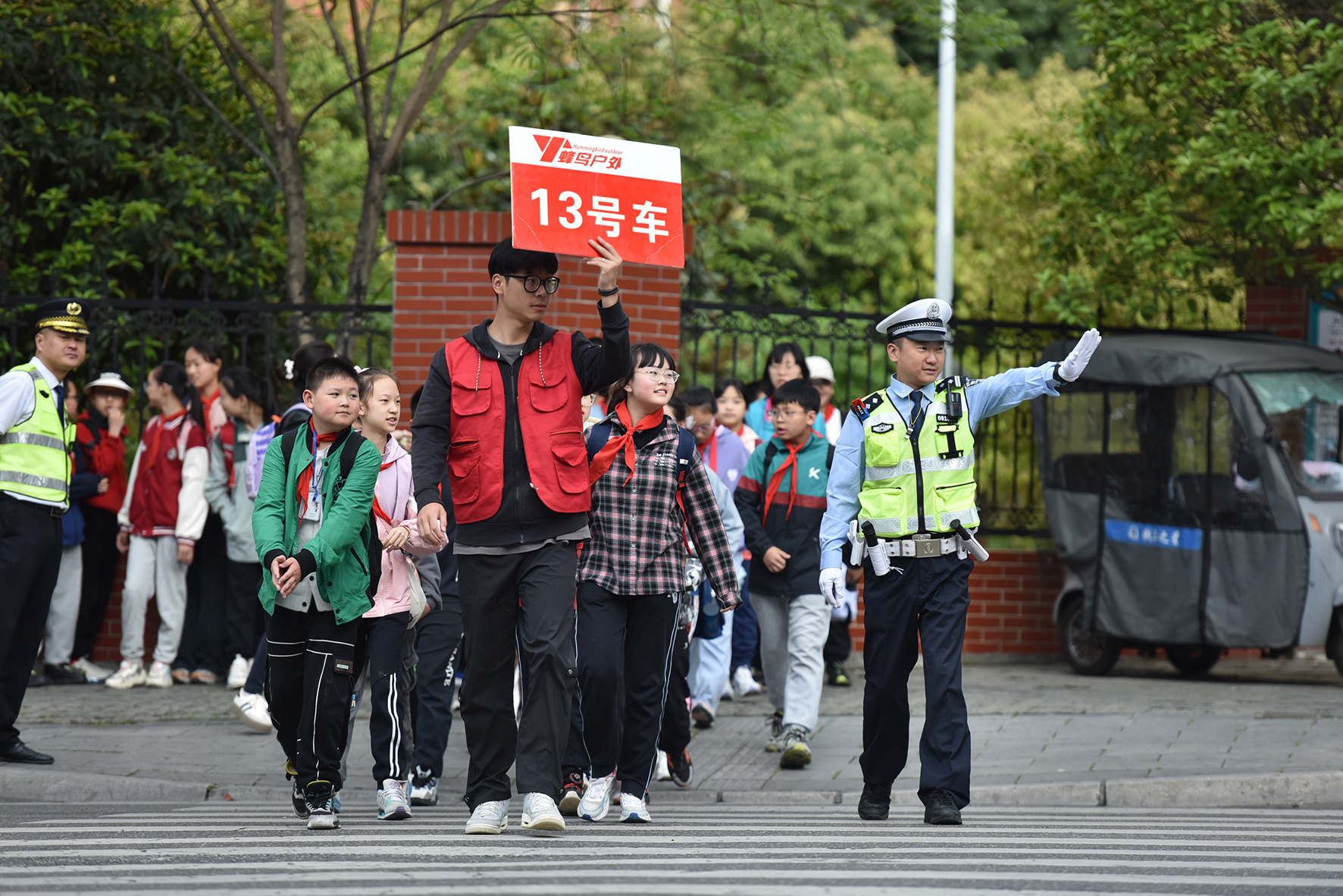 近期,四川省綿陽市多所小學組織學生開展春季研學活動,為保證師生出行安全和減少對交通的影響,綿陽市交警支隊直屬二大隊增派警力在學校門口指揮接送師生的車輛有序停放,護送師生安全過馬路。