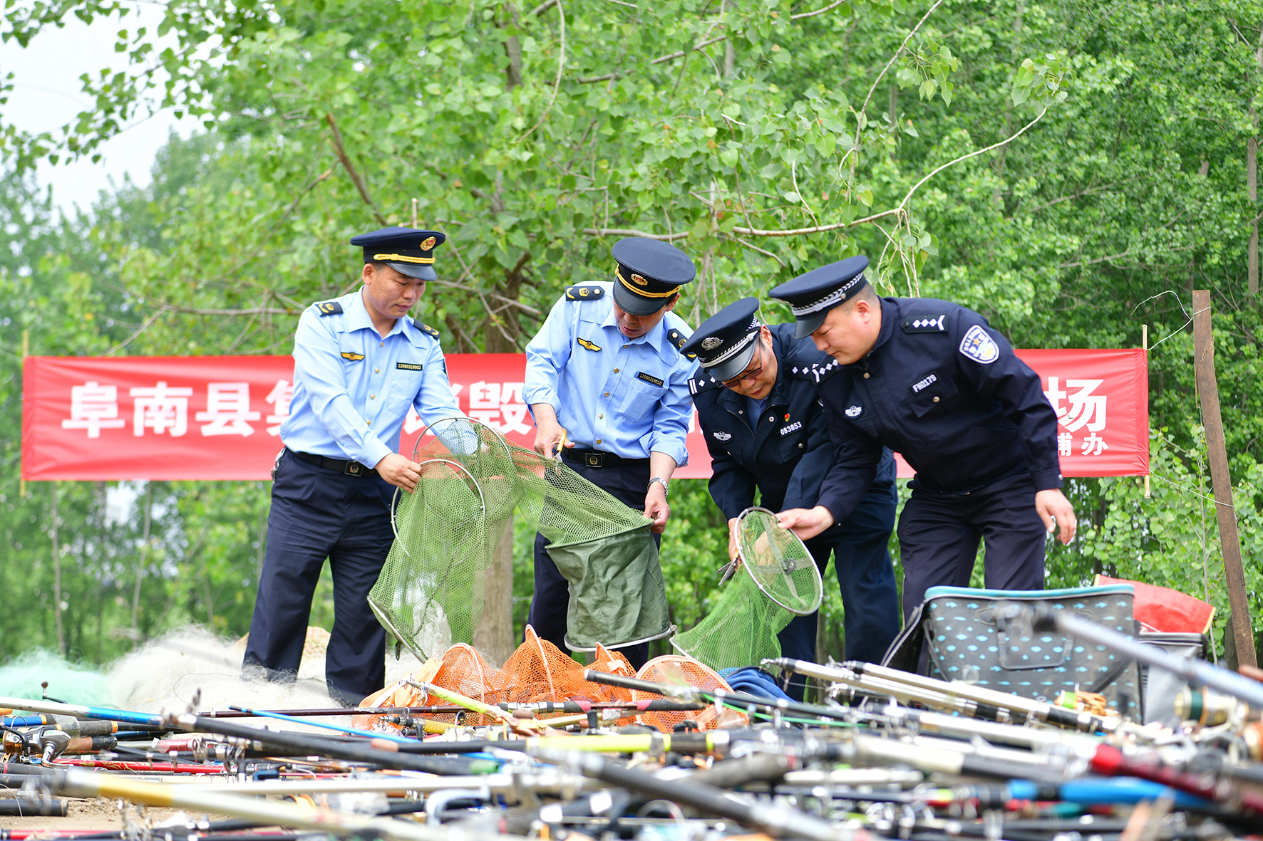 4月23日,安徽省阜南縣公安森林民警和農(nóng)業(yè)執(zhí)法人員在淮河流域曹集鎮(zhèn)集中銷毀一批違法捕撈漁具。