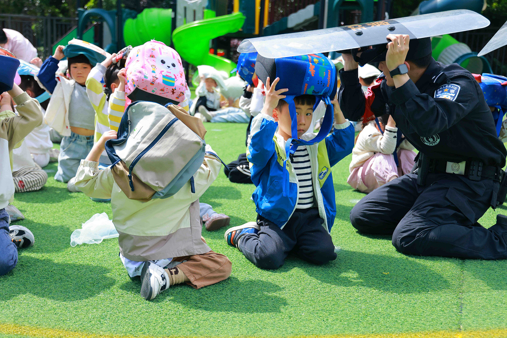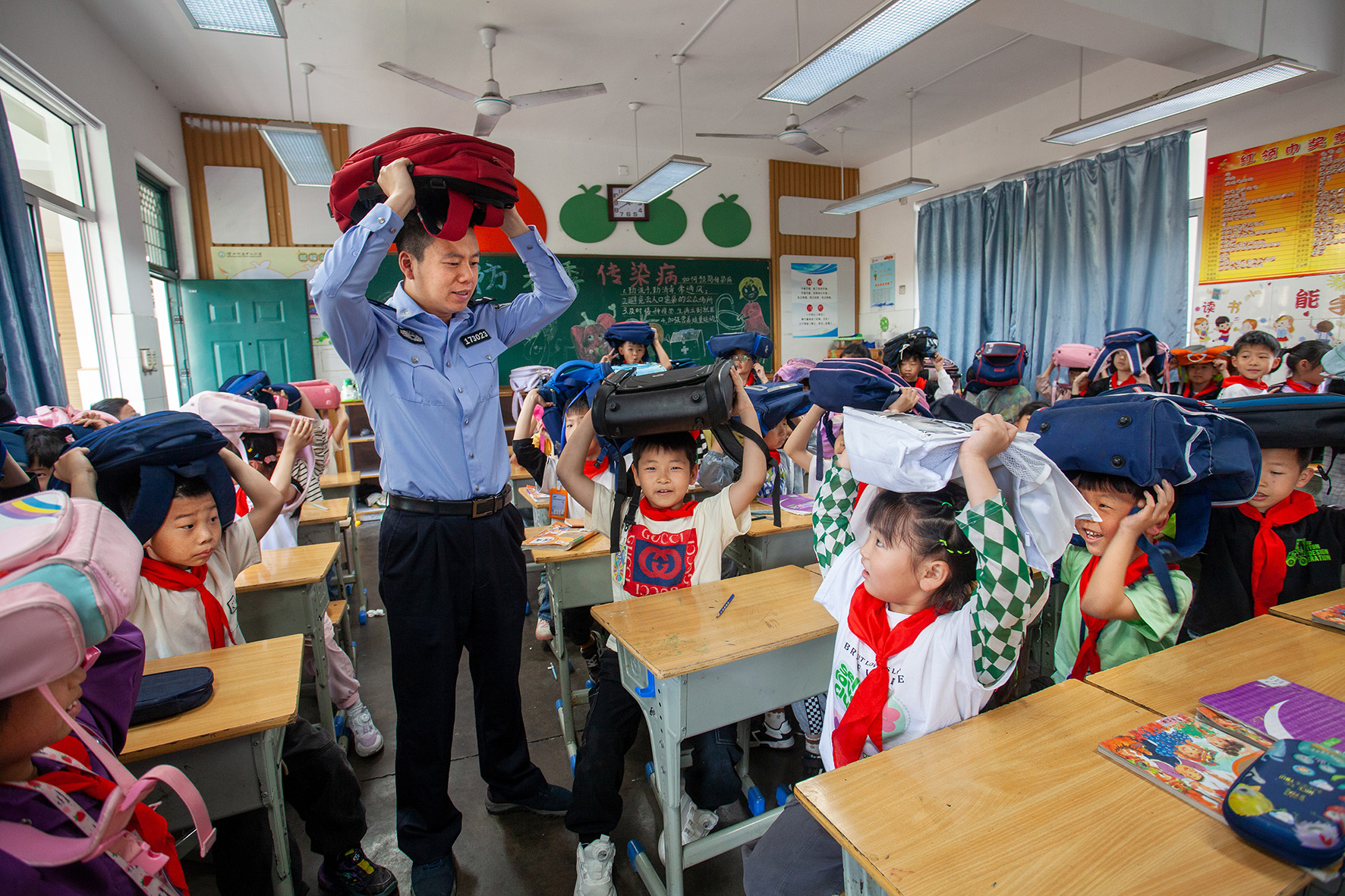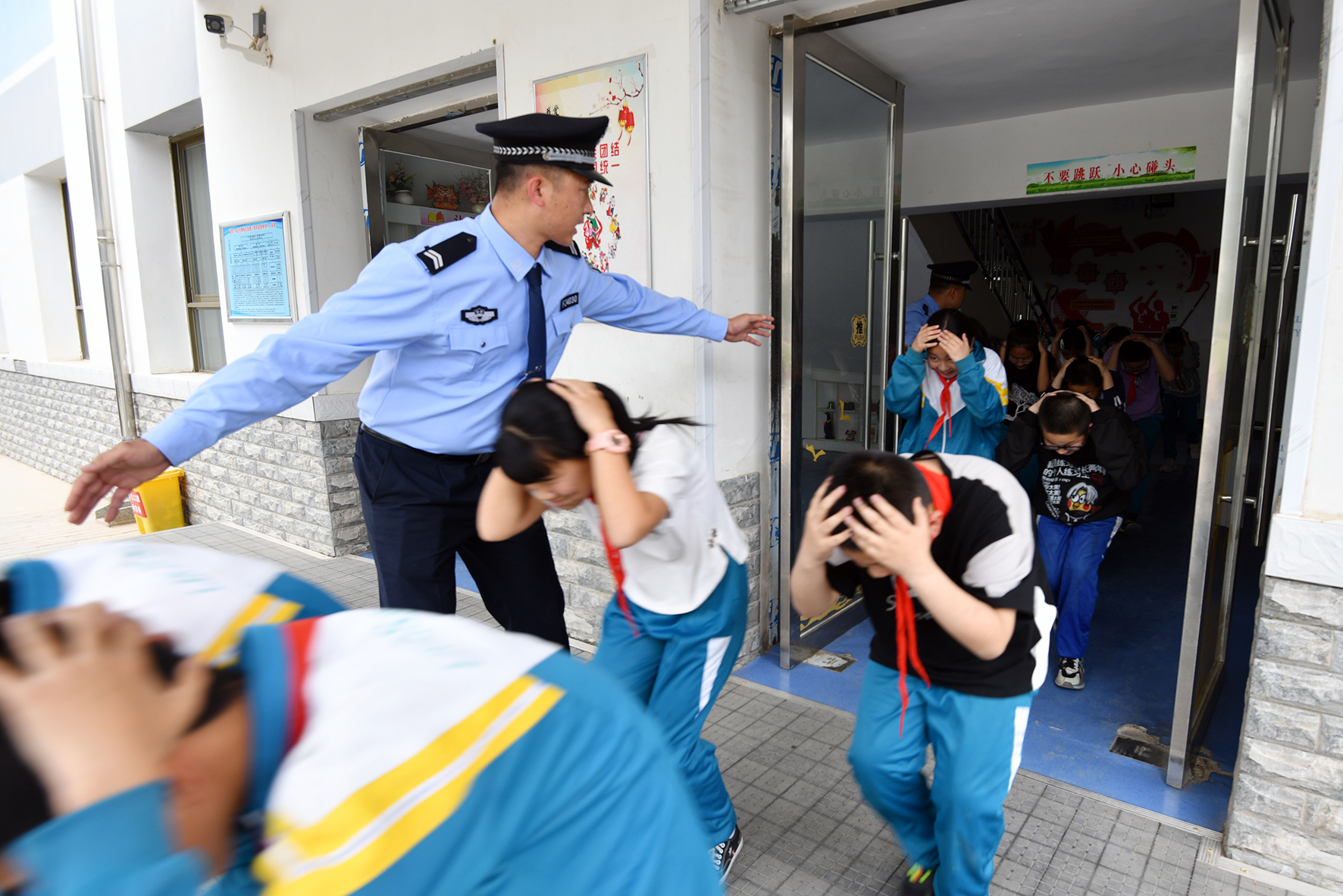 5月9日,安徽省合肥市公安局瑤海分局龍崗派出所民警走進轄區(qū)學校開展防震減災應急疏散演練活動。