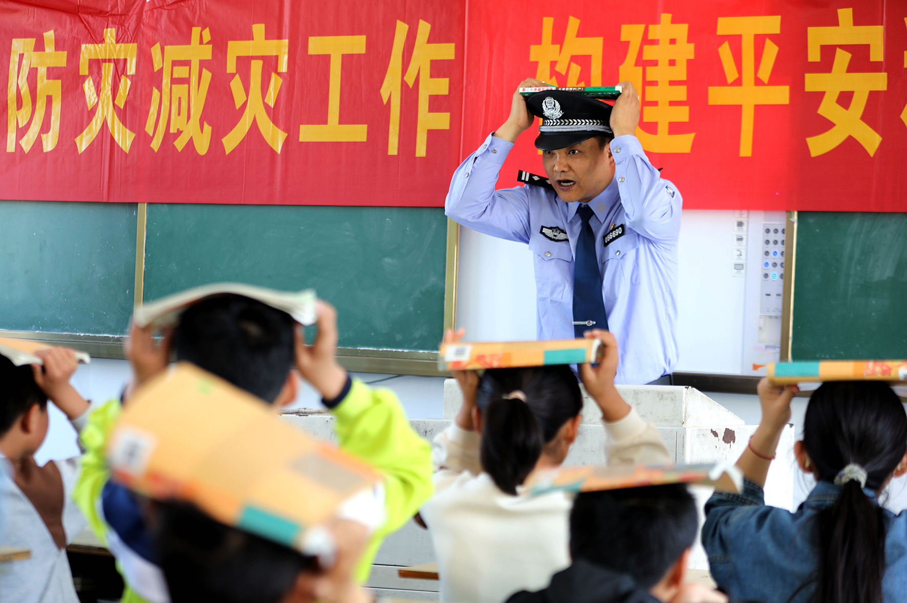 第16個全國防災減災日即將來臨,5月9日,浙江省臺州市公安局黃巖分局澄江派出所民警在澄江中心小學開展“抗震減災”演習,提高學生們應對突發(fā)事件的能力。