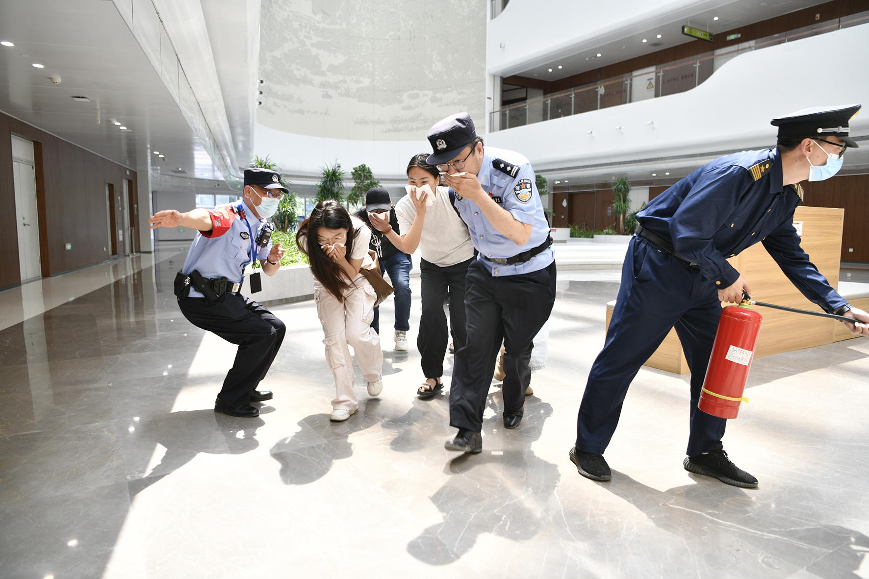 5月9日,河南省鄭州市公安局金水分局巡特警隊員在轄區(qū)大型圖書館開展自然災害應急處置救援演練。