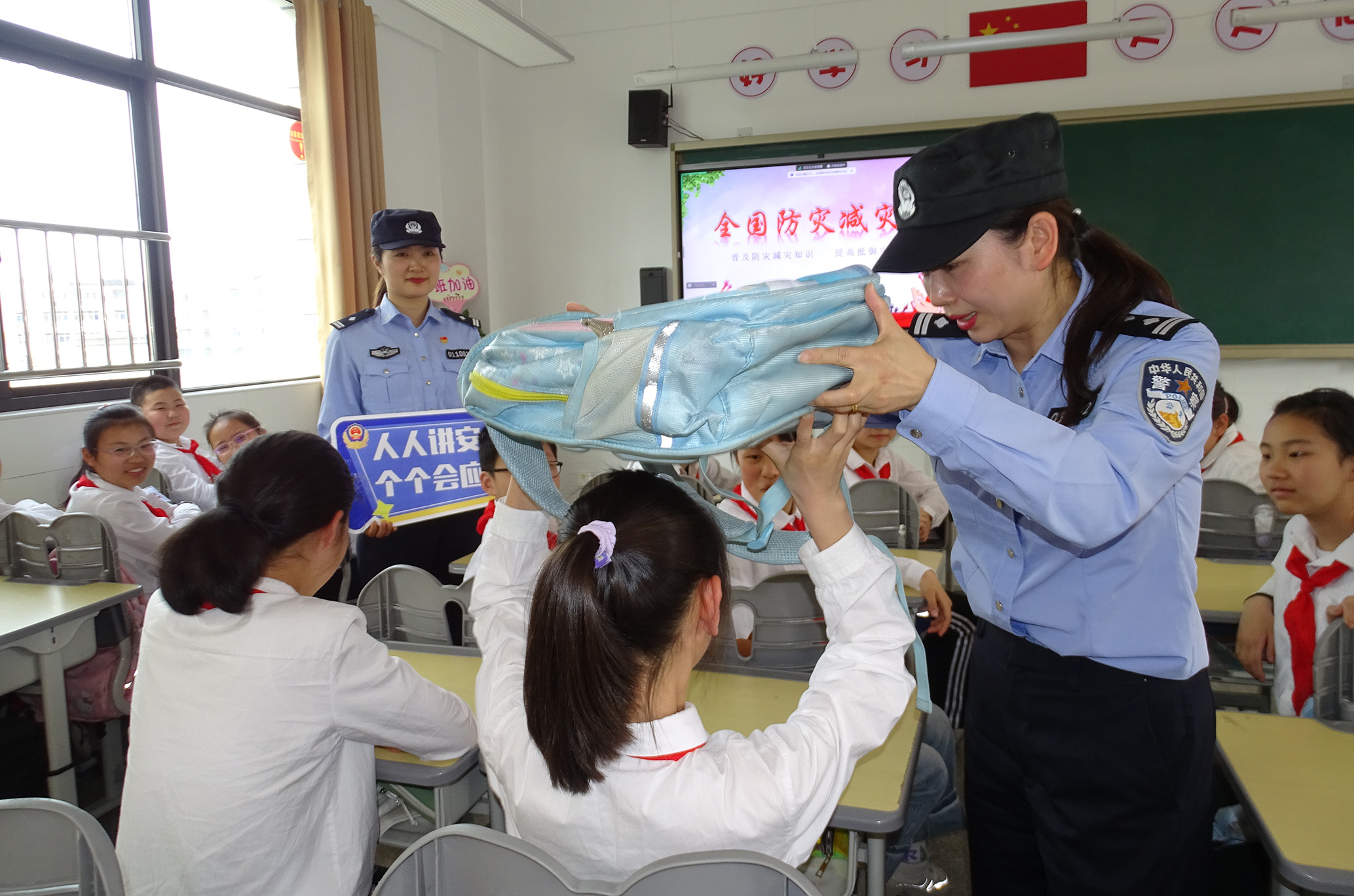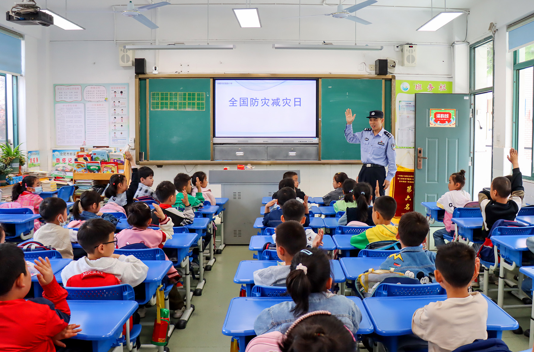 5月10日,安徽省舒城縣公安局闕店派出所民警在課堂上向?qū)W生講解防災減災相關知識。
