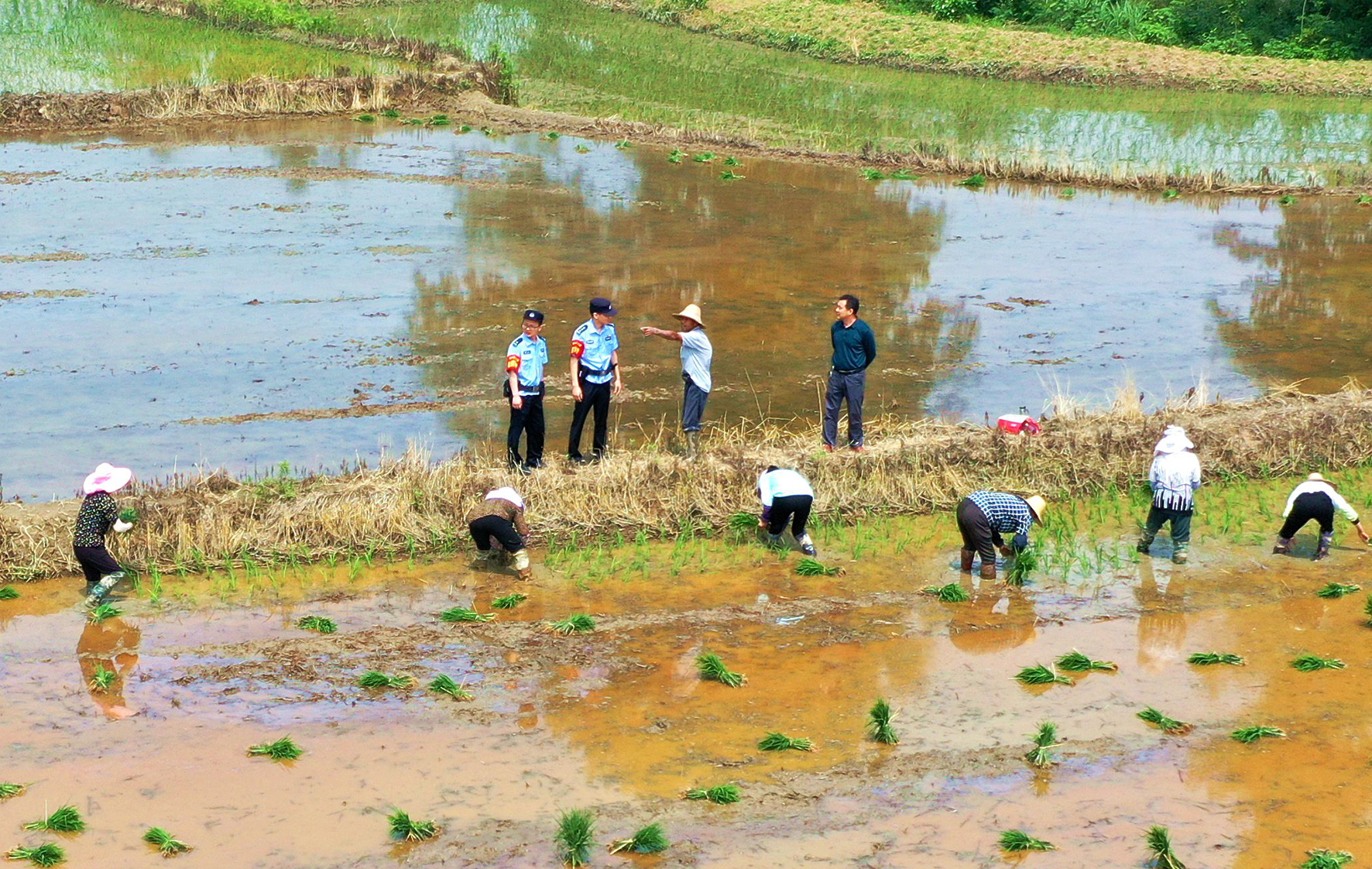 6月7日,安徽省舒城縣公安局張母橋派出所民警深入轄區(qū)農(nóng)林村田間,與栽種水稻秧苗的村民交流了解治安情況?!叭摹睍r(shí)節(jié),張母橋派出所民警以“田間警務(wù)”為著力點(diǎn),深入田間地頭,開展巡邏、防范盜竊、現(xiàn)場(chǎng)化解糾紛等工作,為農(nóng)忙保駕護(hù)航。