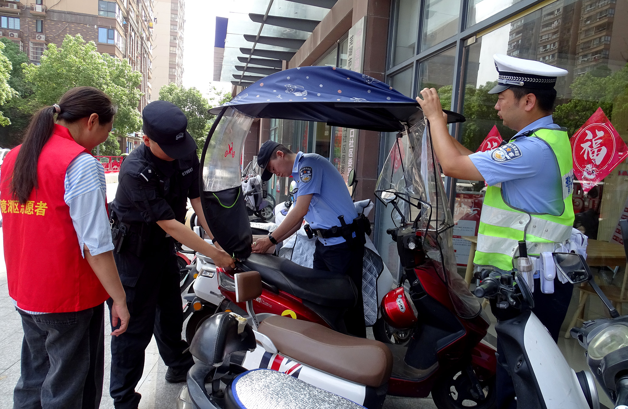 6月12日,安徽省蕪湖市公安局交警支隊鏡湖大隊、鏡湖公安分局特巡警大隊聯(lián)合北門口社區(qū)開展電動車管理“掃樓”專項行動,嚴(yán)查電動車非法加裝遮陽篷、駕乘人員不戴頭盔、不規(guī)范停車等交通違法行為。