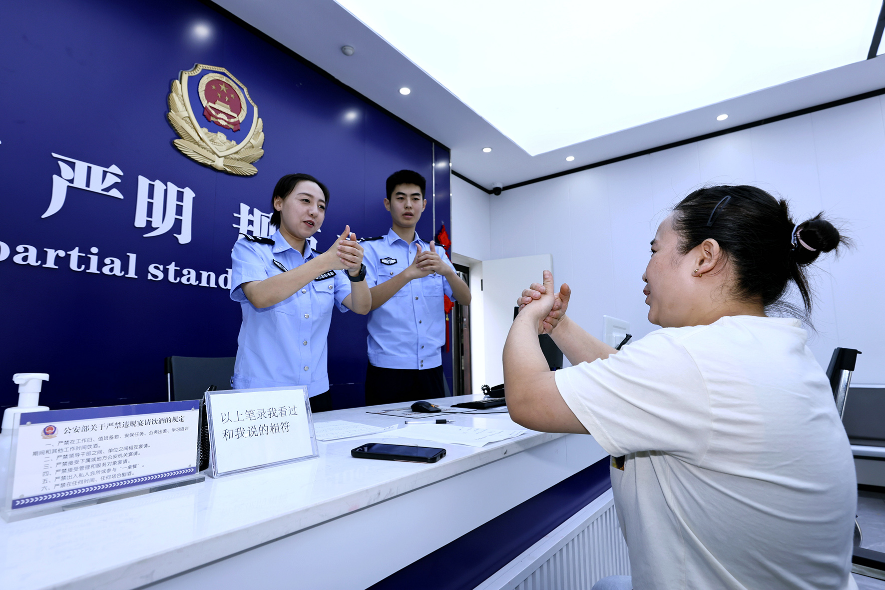 7月15日,在安徽省寧國市公安局刑偵大隊(duì),一名患有聽力與語言障礙的受騙群眾收到民警追回的萬余元損失時(shí)用手語表示感謝。