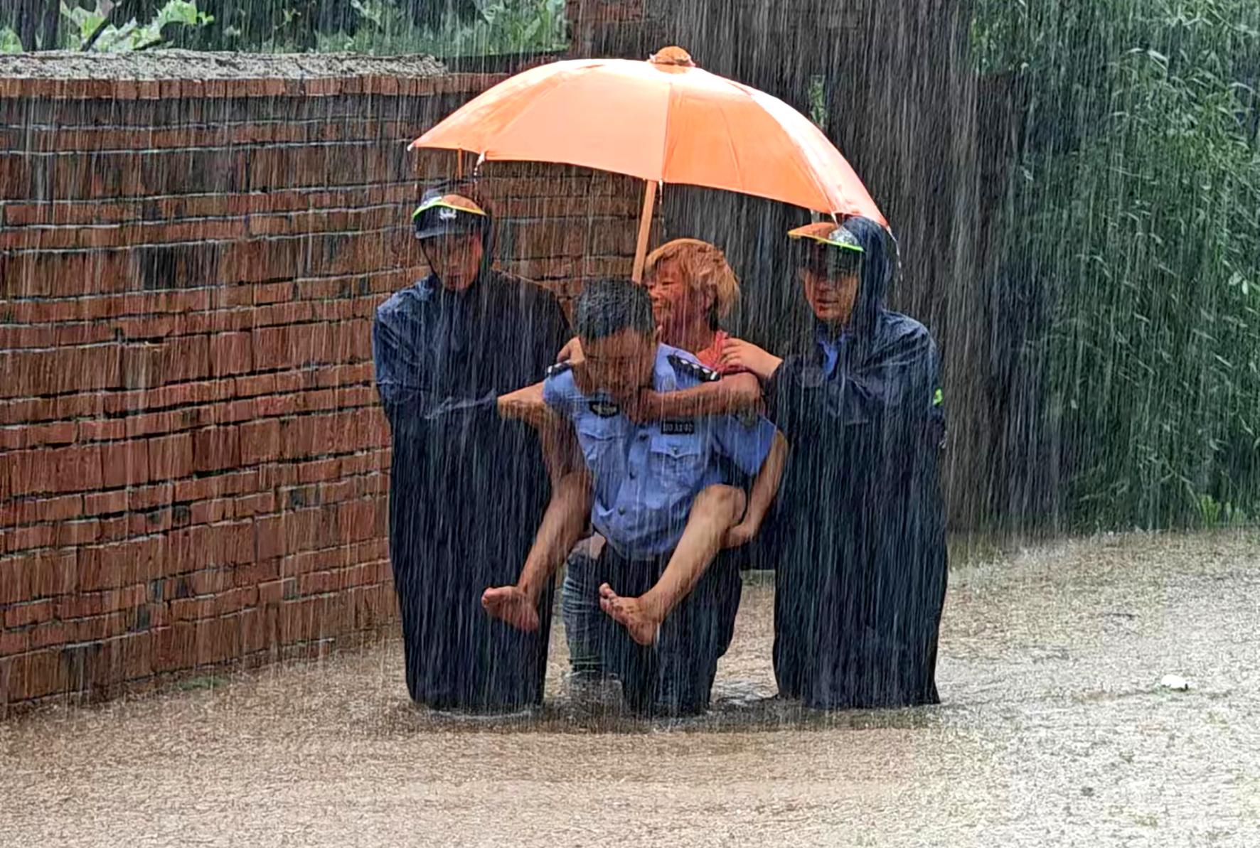 7月17日,安徽省亳州市公安局譙城分局顏集派出所民警迎著暴雨,將被困在家中的老人營(yíng)救到安全區(qū)域,并妥善安置。