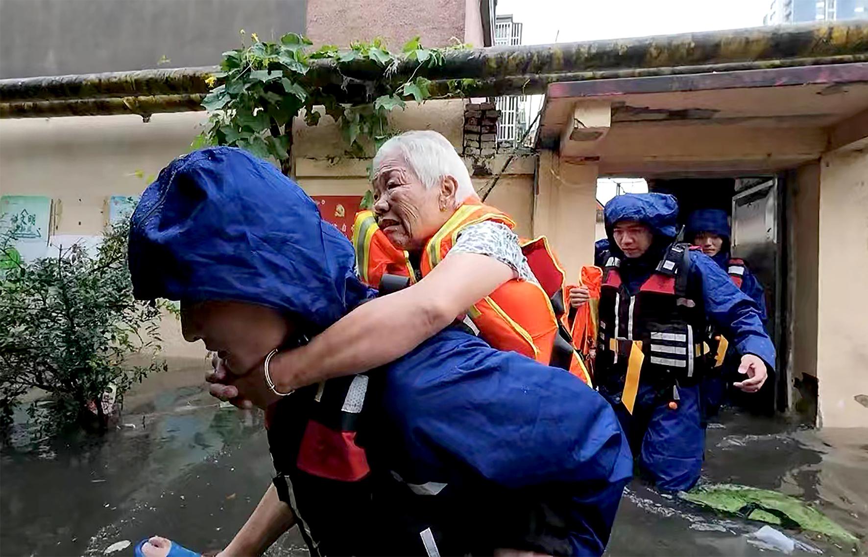 圖為7月17日,消防救援人員正在緊急轉(zhuǎn)移被困群眾。