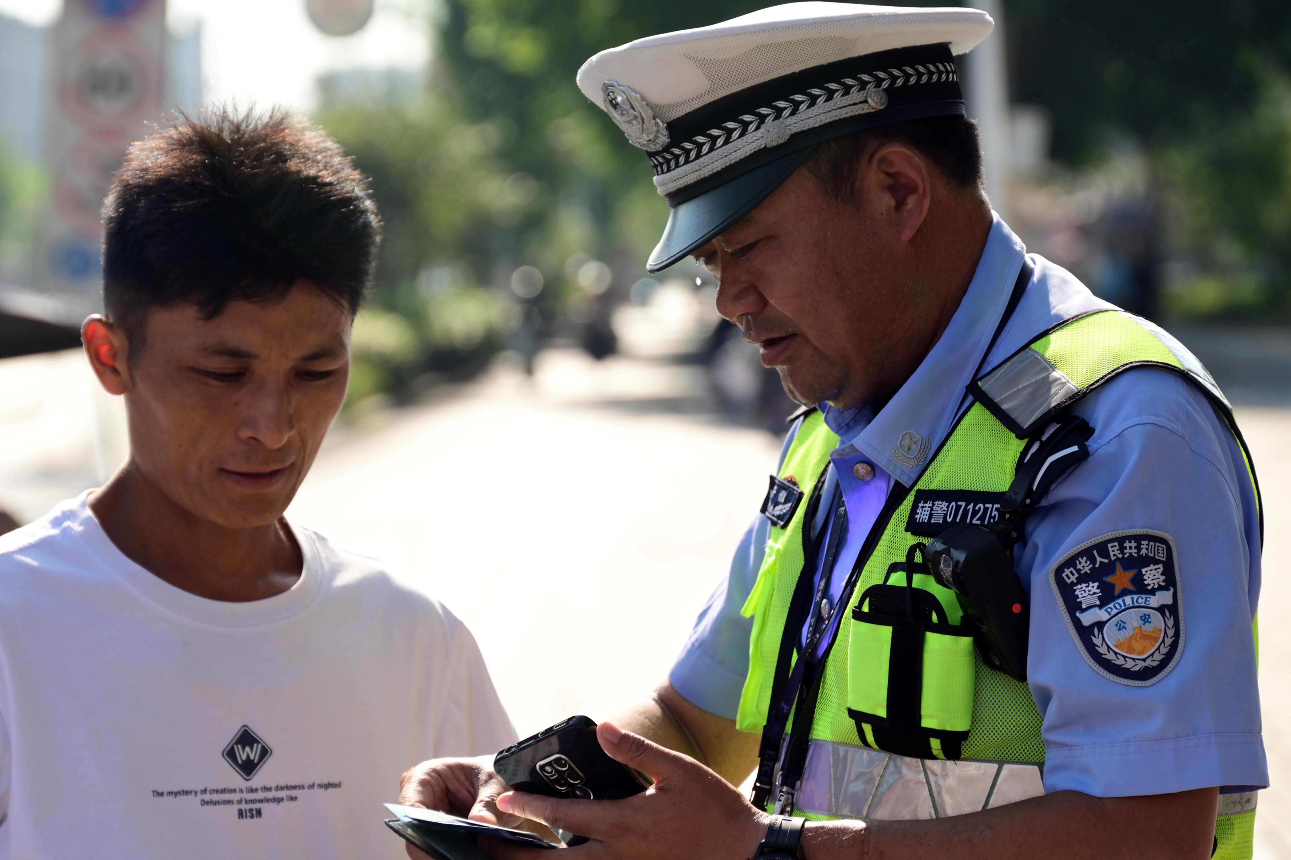 8月5日,安徽省固鎮(zhèn)縣公安局交管大隊的民警輔警冒著38攝氏度高溫在澮河路指揮疏導(dǎo)交通、提示安全駕駛。
