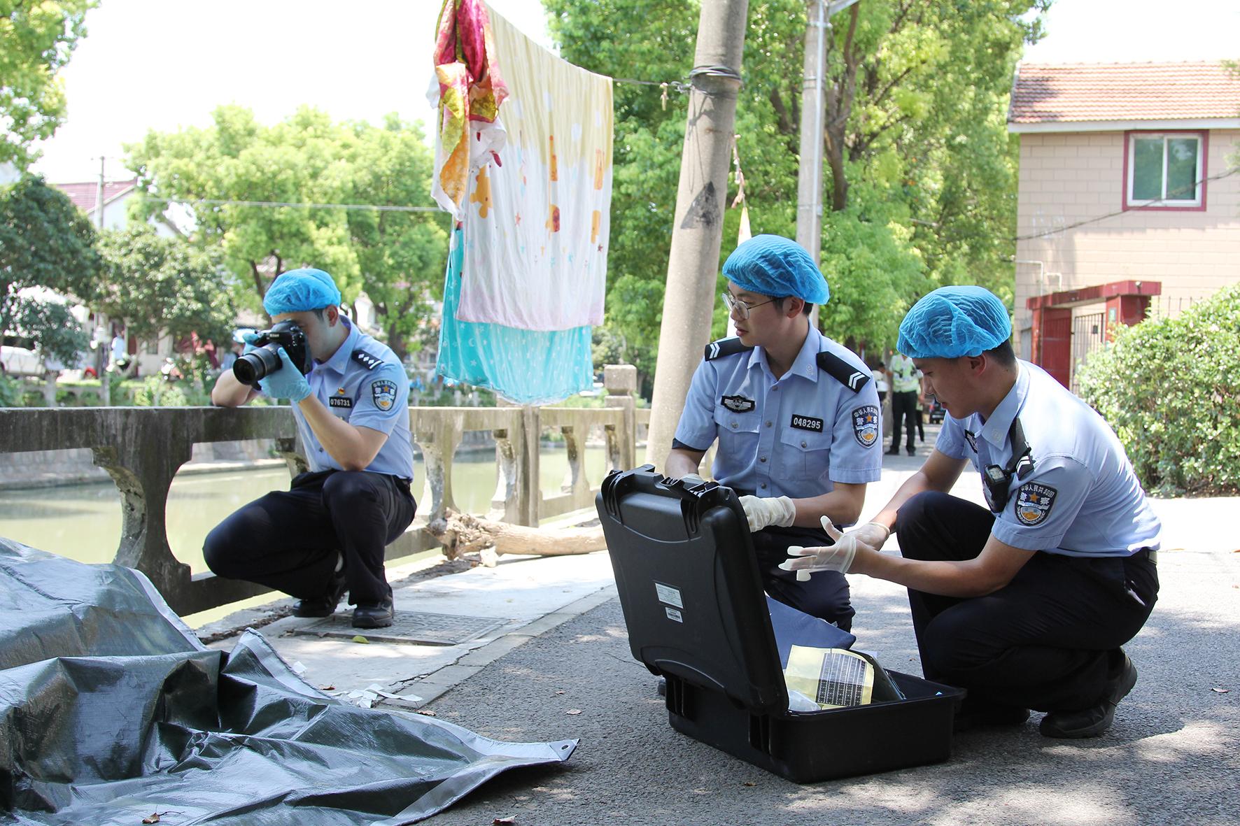 8月4日,上海市公安局嘉定分局刑科所民警與轄區(qū)派出所民警冒著攝氏40℃高溫在案發(fā)地進行現(xiàn)場勘察。