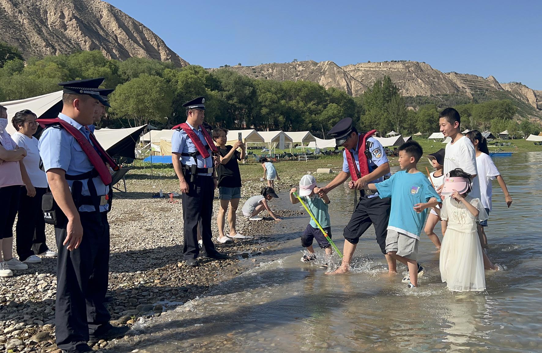 圖為8月6日,民警對(duì)涉水小朋友們進(jìn)行安全警示教育。