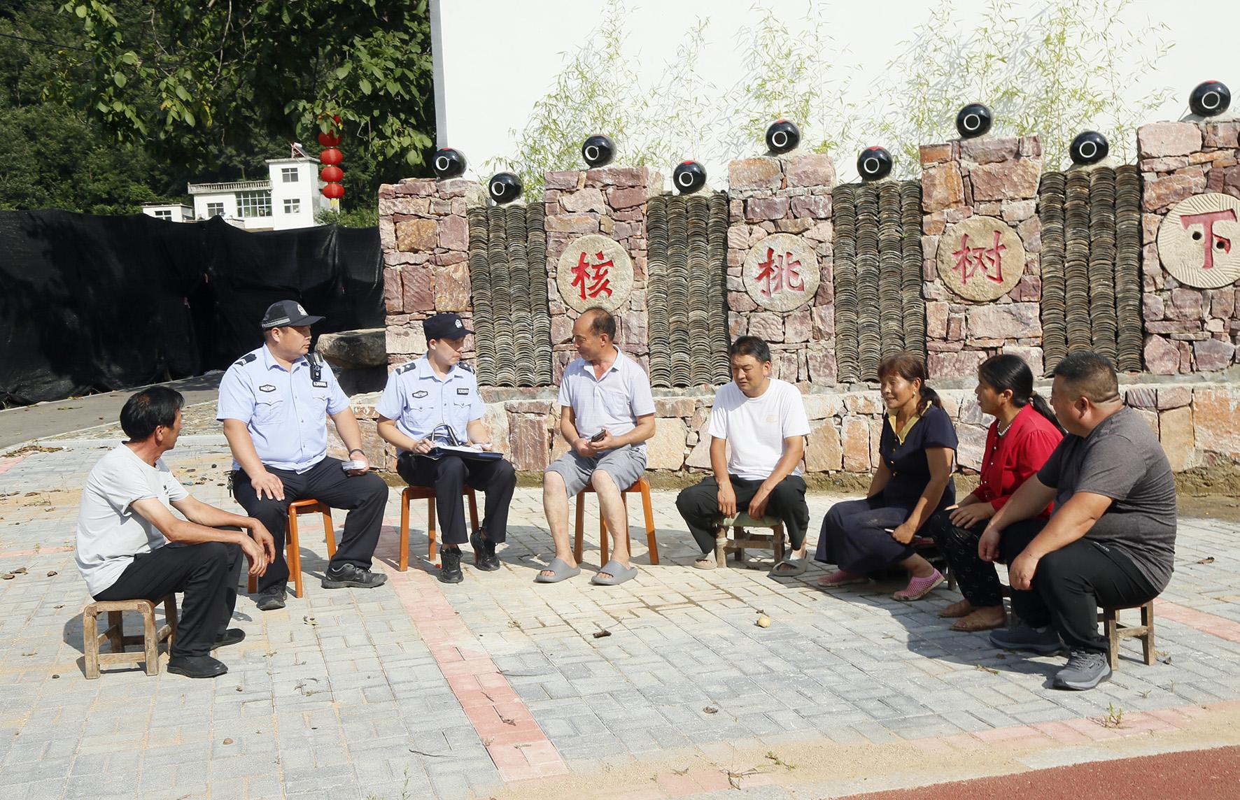 圖為8月6日,汝陽縣公安局靳村派出所民輔警和鄉(xiāng)平安建設(shè)辦公室工作人員在石寨村與群眾座談,了解情況征詢意見。