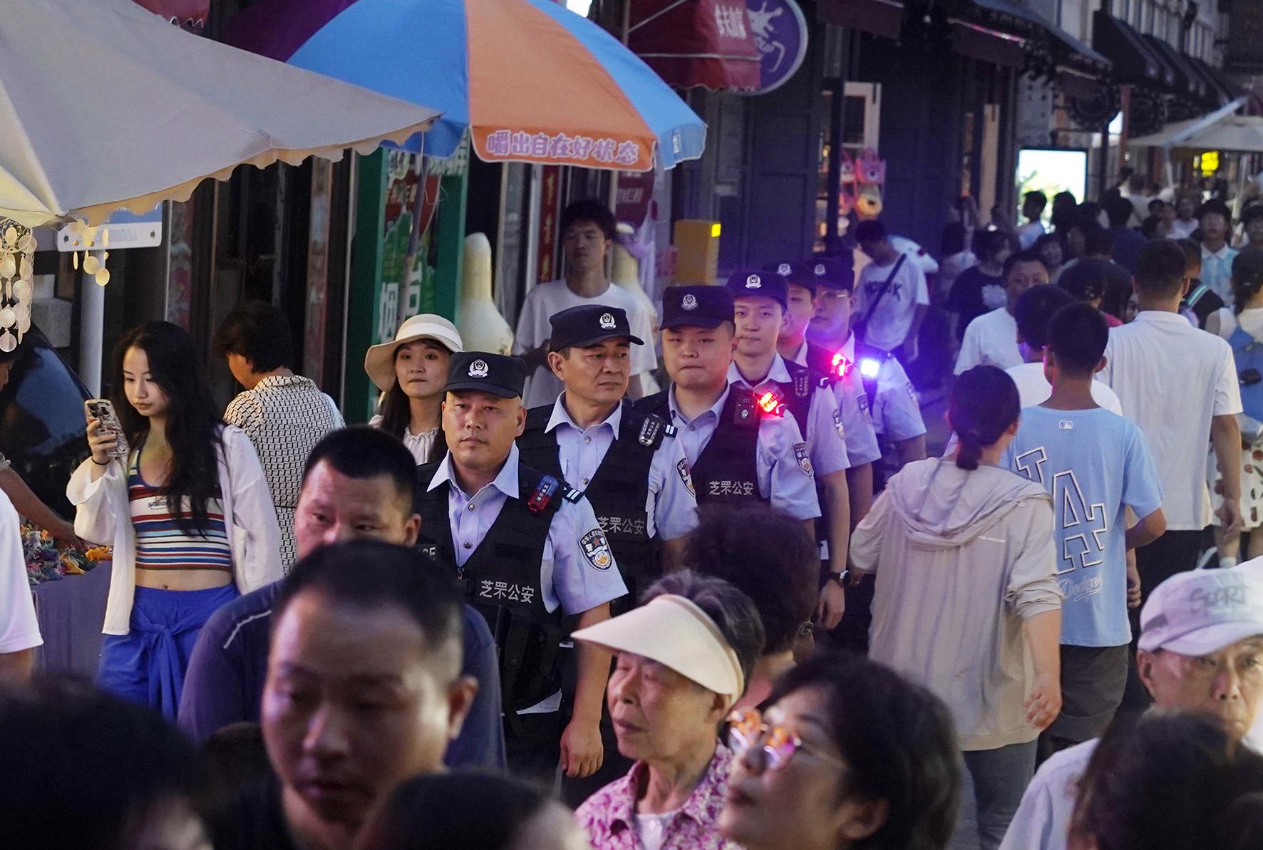 圖為煙臺(tái)市公安局芝罘分局民警在朝陽街景區(qū)巡邏。
