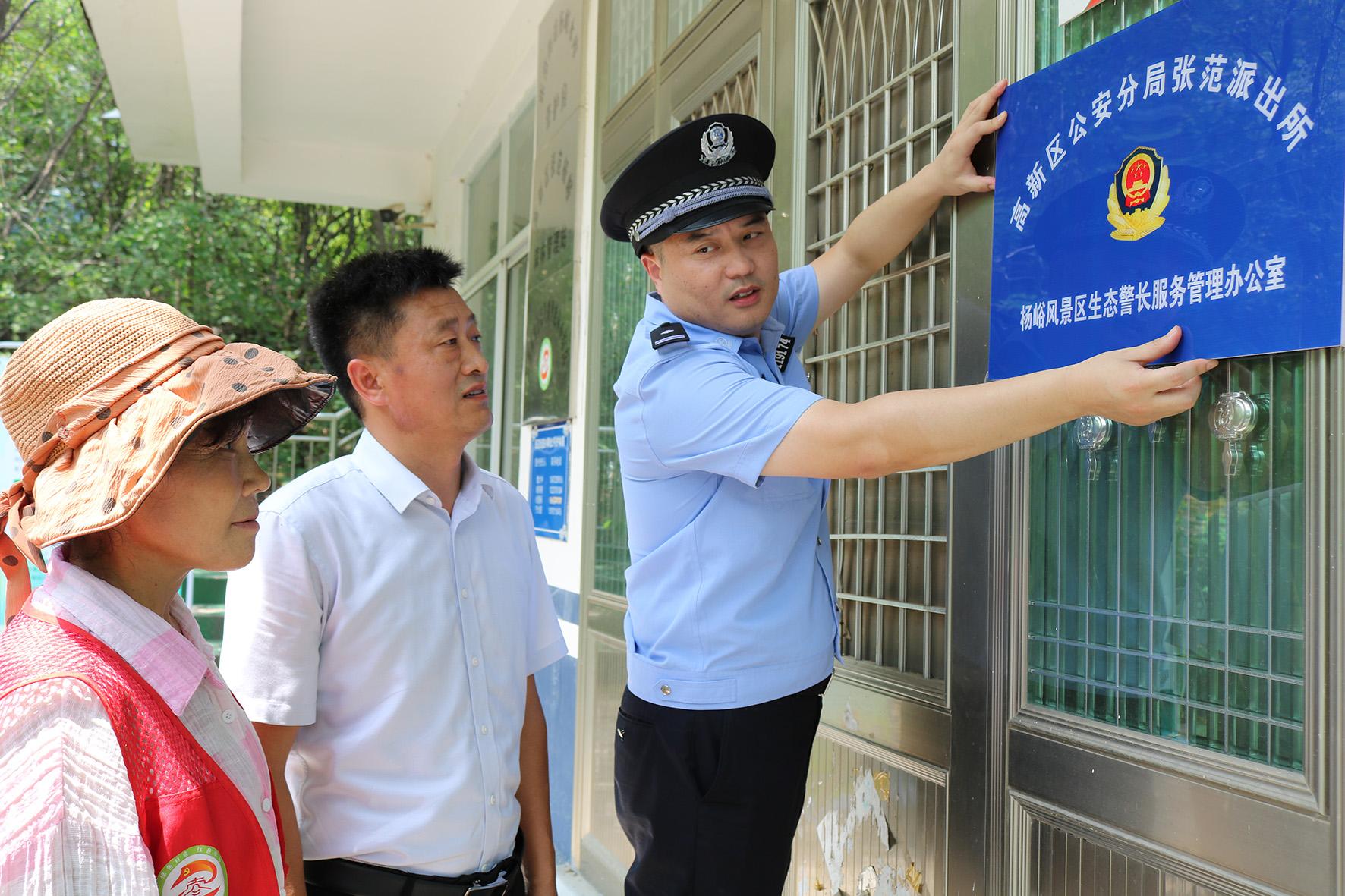 8月9日,在山東省棗莊市高新區(qū)楊峪風(fēng)景區(qū),生態(tài)警長(zhǎng)掛牌上崗。今年以來,棗莊市公安局高新區(qū)分局堅(jiān)定踐行“綠水青山就是金山銀山”理念,主動(dòng)將公安工作融入綠色崛起、融合振興的高質(zhì)量發(fā)展大局,全面實(shí)施“生態(tài)警務(wù)”機(jī)制,通過設(shè)立“生態(tài)警務(wù)室”,構(gòu)建生態(tài)警長(zhǎng)+治安員+消防員+護(hù)林員+網(wǎng)格員+宣傳員“一長(zhǎng)五員”生態(tài)警務(wù)模式,以“警察藍(lán)”護(hù)航“生態(tài)綠”,守護(hù)綠水青山。