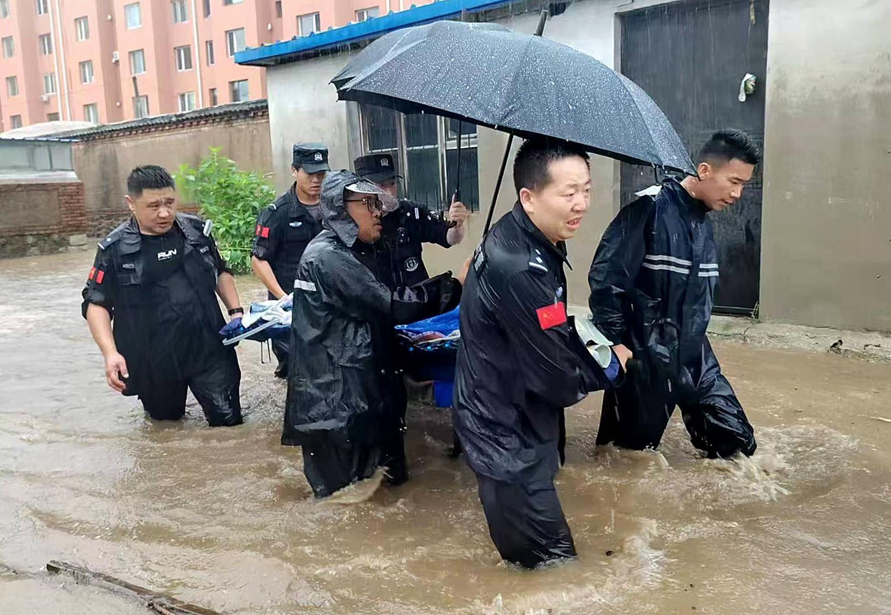 8月20日,遼寧省葫蘆島市建昌縣公安局鎮(zhèn)北派出所民輔警和巡特警隊(duì)員在暴雨中挨戶排查險(xiǎn)情時(shí),發(fā)現(xiàn)受災(zāi)的平房里有一位重病老人,立即用擔(dān)架將老人送往救助站。