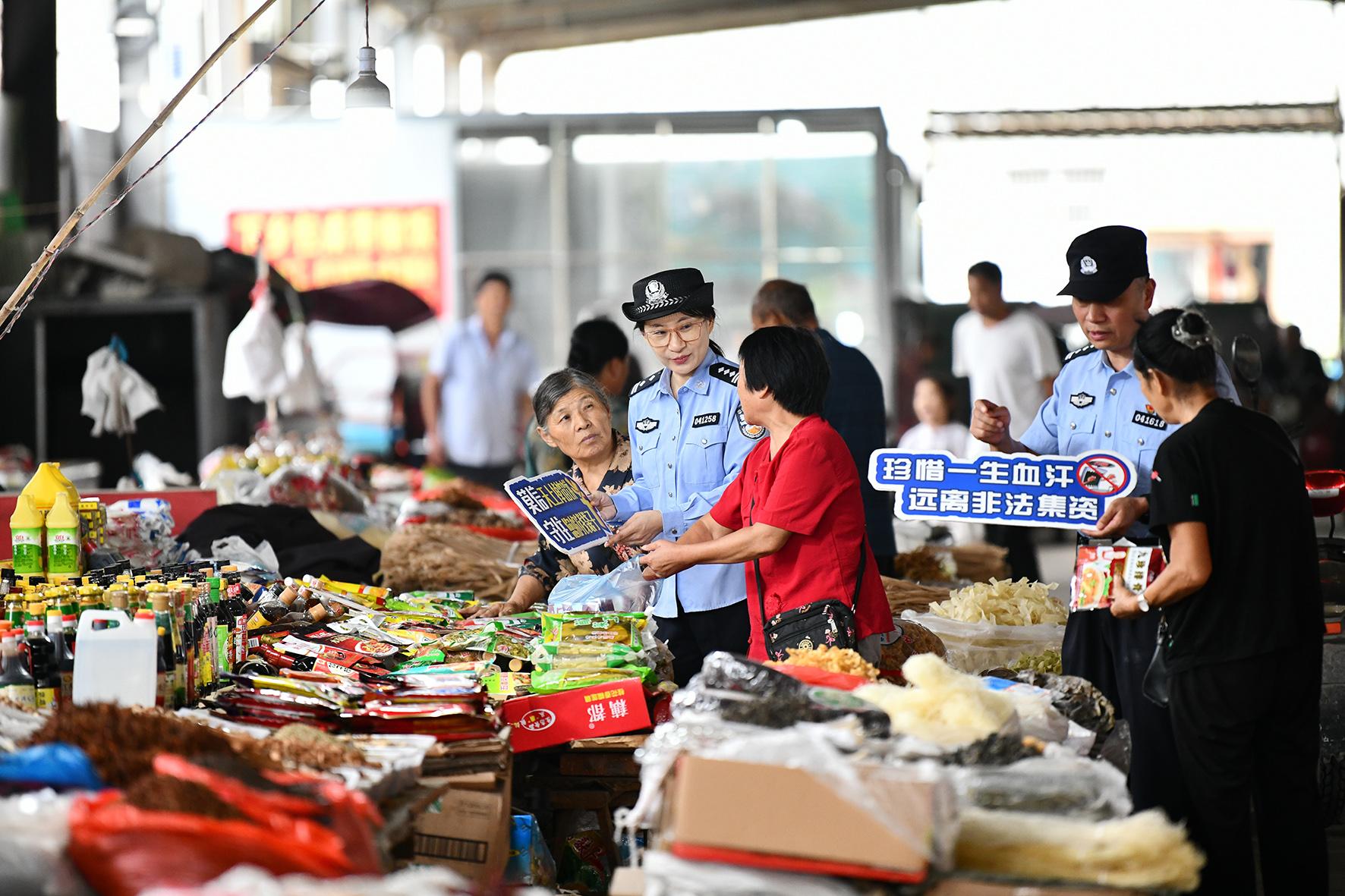 8月27日,安徽省阜南縣公安局民警在農(nóng)貿(mào)市場(chǎng)向群眾宣講養(yǎng)老詐騙、非法集資、經(jīng)營(yíng)式傳銷等經(jīng)濟(jì)犯罪的手段和危害性。