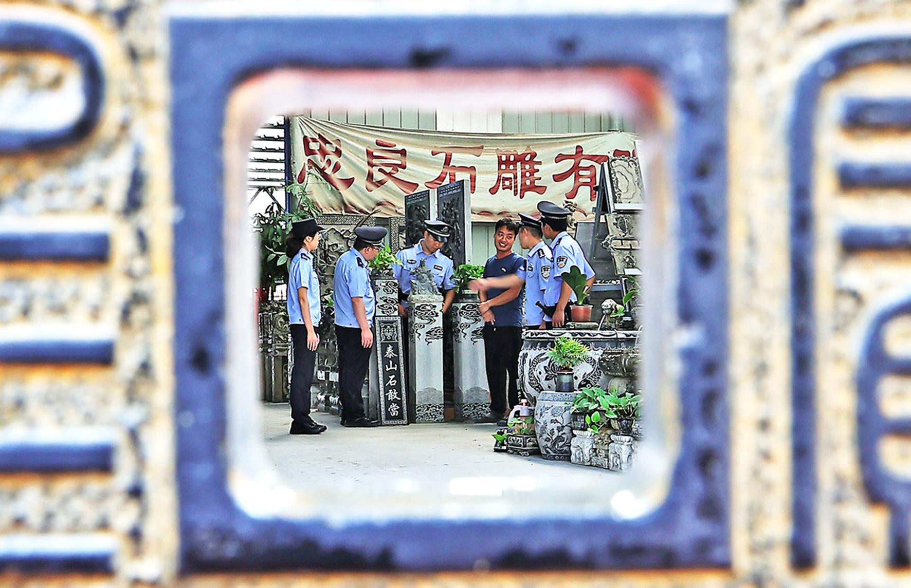9月5日,山西省運(yùn)城市新絳縣公安局北張派出所民警輔警走進(jìn)北張鎮(zhèn)西莊村石雕工藝園區(qū),與非遺傳承人拉家常、說(shuō)安防。
