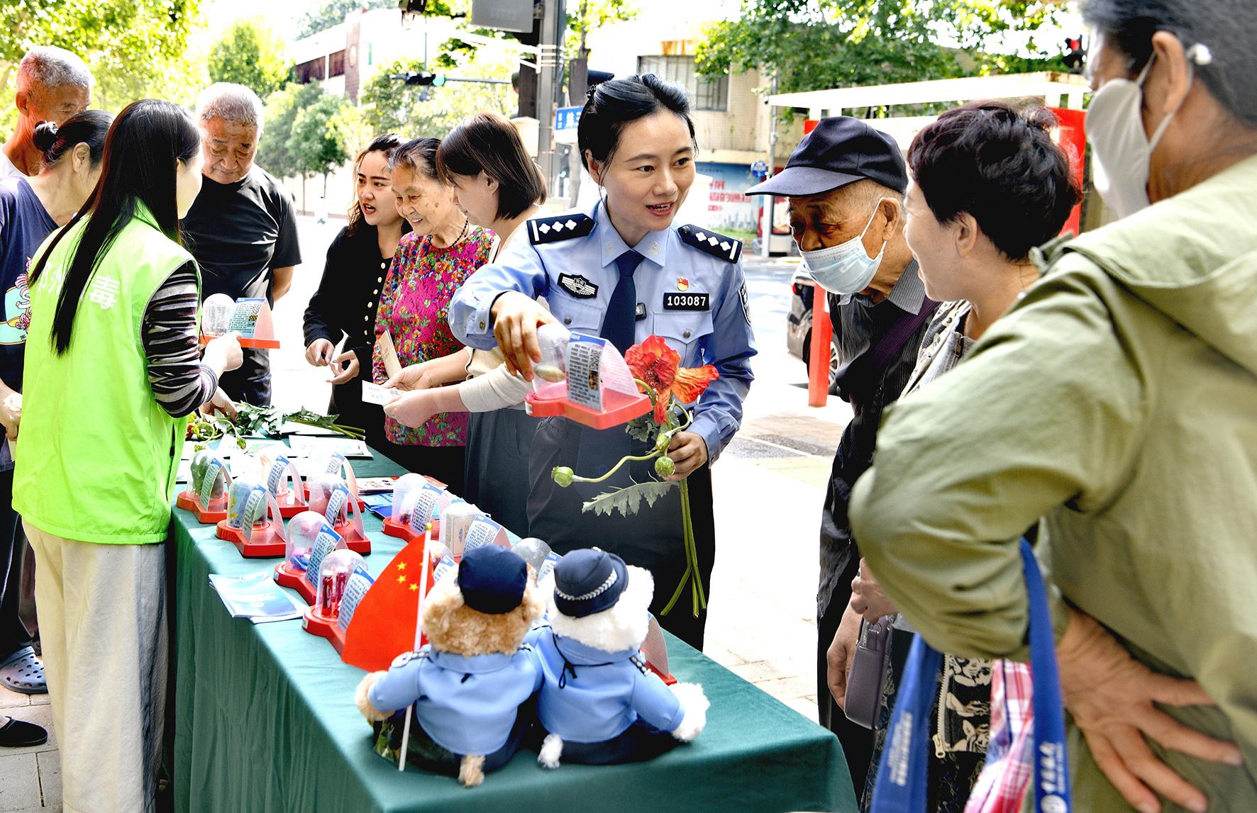 9月23日,河南省鄭州市公安局金水分局巡特警與經(jīng)八路派出所民輔警走進(jìn)社區(qū)開展禁毒宣傳活動。