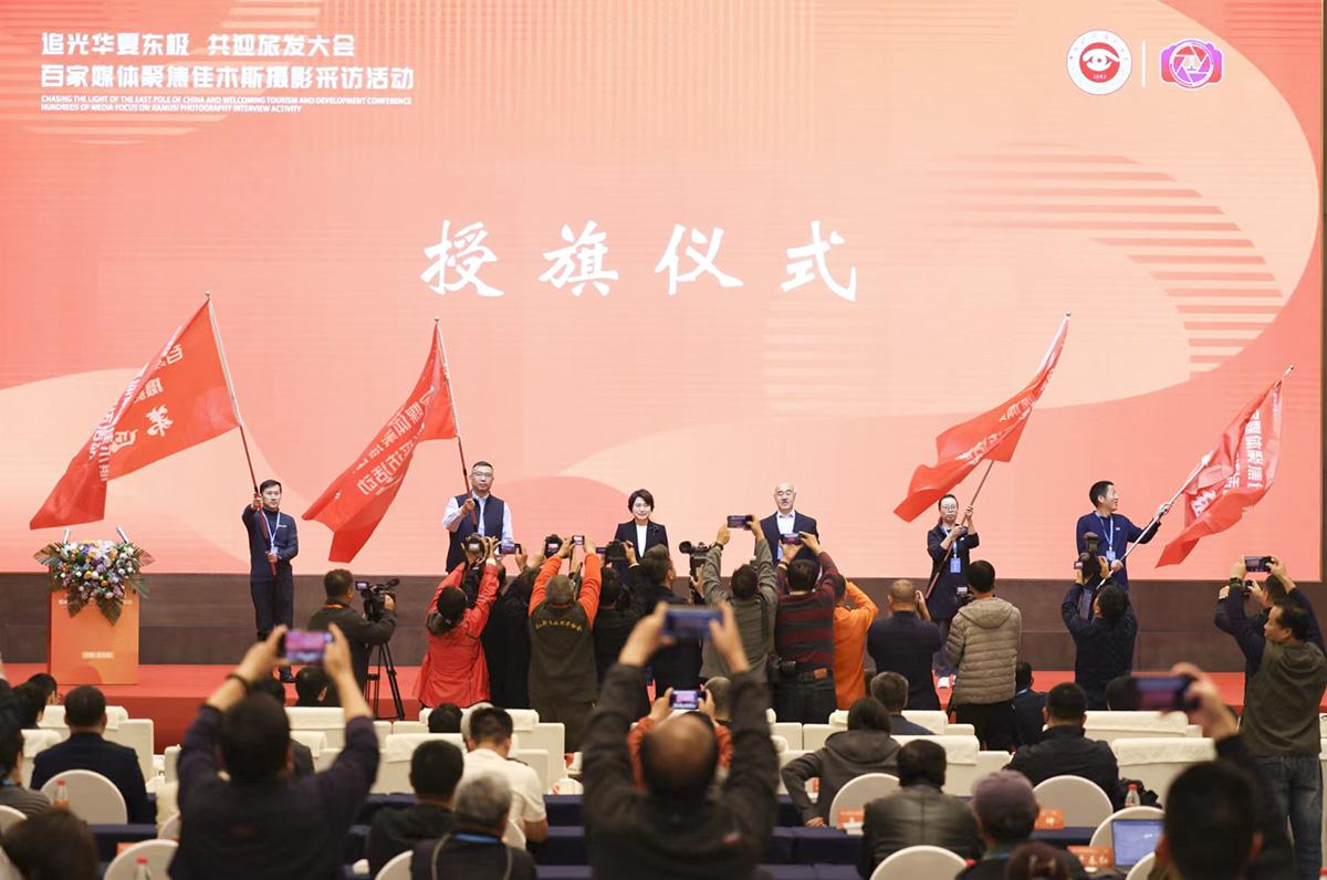 圖為中共佳木斯市委書記叢麗(左三)、中國新聞攝影學會會長蘭紅光(右三)為4個攝影采訪小組授旗。
