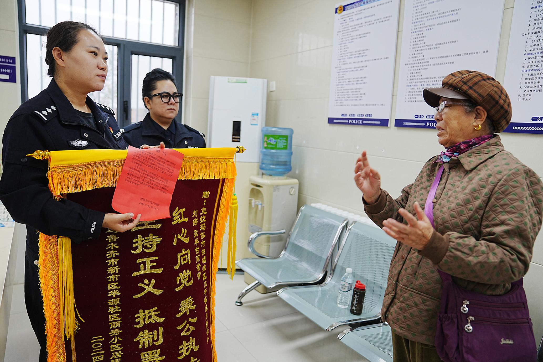 10月29日,新疆維吾爾自治區(qū)烏魯木齊市馬女士跨越300公里專程來(lái)到克拉瑪依市公安局三平鎮(zhèn)派出所,將一面錦旗贈(zèng)給民警,感謝民警幫助其解決了兒子長(zhǎng)期沒(méi)有的戶口問(wèn)題。