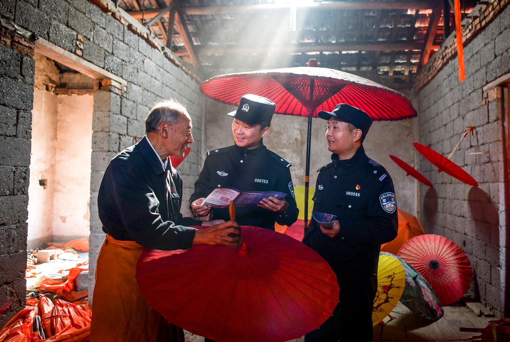 為護航非物質(zhì)文化遺產(chǎn)健康發(fā)展,11月4日,安徽省涇縣公安局昌橋派出所民警來到昌橋鄉(xiāng)孤峰油紙傘廠,開展“嘮家常 話安全”活動。